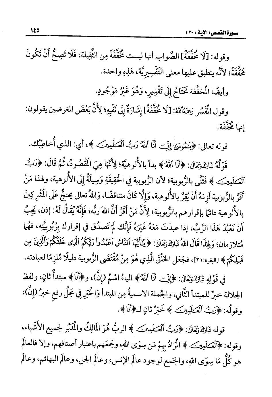 قَوْلُهُ تَبَارَكَ وَتَعَالَى: {أَنَا اللَّهُ} بدأ بالأُلوهيَّة؛ لِأَنَّهَا هِيَ المَقْصُودُ، ثُمَّ قَالَ: {رَبُّ الْعَالَمِينَ} فَثَنَّى بالرُّبوبية؛ لأن الرُّبوبية فِي الْحَقِيقَةِ وَسِيلَةٌ إِلَى الأُلوهية، ولهذا مَنْ أَقَرَّ بالرُّبوبية لَزِمَهُ أَنْ يُقِرَّ بالأُلوهية، وَإلَّا كَانَ متناقضًا، وَاللَّهُ تعالى يحتحُّ عَلَى المُشْرِكِينَ بالأُلوهية دائمًا بإقرارهم بالرُّبوبية؛ لِأَنَّ مَنْ أَقَرَّ أَنَّ اللَّهَ ربُّه، فَإِنَّهُ يُقَالُ لَهُ: إذن، يَجِبُ أَنْ تَعْبُدَ هَذَا الرَّبَّ، إذا عبدْتَ مَعَهُ غَيْرَهُ فَإِنَّك لَمْ تَصدُق في إقرارك بِرُبُوبِيَّتِه، فهُما مُتلازمان؛ وَلِهَذَا قَالَ اللَّهُ تَبَارَكَ وَتَعَالَى: {يَاأَيُّهَا النَّاسُ اعْبُدُوا رَبَّكُمُ الَّذِي خَلَقَكُمْ وَالَّذِينَ مِنْ قَبْلِكُمْ} [البقرة: ٢١]، فجَعَل الخَلْقَ الَّذِي هُوَ مِنْ مُقْتَضَى الرُّبوبية دليلًا مُلزِمًا لعبادته.