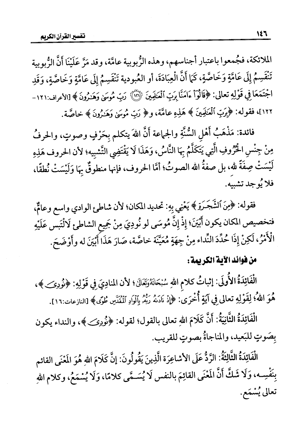 الْفَائِدَةُ الثَّالِثَةُ: الرَّدُّ عَلَى الأشاعِرَة الَّذِينَ يَقُولُونَ: إنَّ كَلَامَ اللَّهِ هُوَ المَعْنَى القائم بِنَفْسِه، وَلَا شَكَّ أَنَّ المَعْنَى القائِمَ بالنفس لَا يُسَمَّى كلامًا، وَلَا يُسْمَعُ، وكلام اللَّهِ تعالى يُسْمَع.