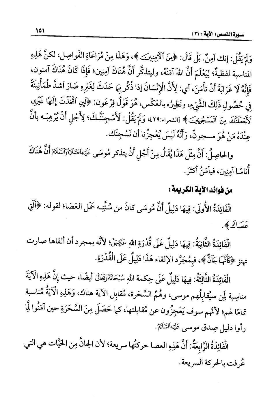 الْفَائِدَةُ الثَّانِيَةُ: فِيهَا دَلِيلٌ عَلَى قُدْرةِ اللَّهِ عَزَّ وَجَلَّ، لأَنَّه بمجرد أن ألقاها صارت تهتز {كَأَنَّهَا جَانٌّ}، فبِمُجَرَّد الإلقاء هَذَا دَلِيلٌ عَلَى الْقُدْرَةِ.