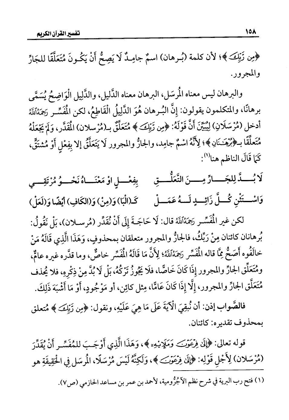 والبرهان ليس معناه المُرسَل، البرهان معناه الدَّليل، والدَّلِيل الْوَاضِحُ يُسَمَّى برهانًا، والمتكلمون يقولون: إِنَّ البُرهان هُوَ الدَّلِيلُ الْقَاطِعُ، لكن المُفَسِّر رَحِمَهُ اللَّهُ أدخل (مُرْسَلَانِ) لِيُبَيِّنَ أَنَّ قَوْلَهُ: {مِنْ رَبِّكَ} مُتَعَلِّقٌ بـ (مُرْسلان) المُقَدَّر، وَلَمْ يَجْعَلْهُ مُتَعلِّقًا بـ {بُرْهَانَانِ}؛ لِأَنَّهُ اسْمٌ جامِد، والجارُّ والمجرور لَا يَتَعَلَّقُ إلا بفِعْل أَوْ مُشتَقٍّ، كَمَا قَالَ الناظم هنا (¬١):