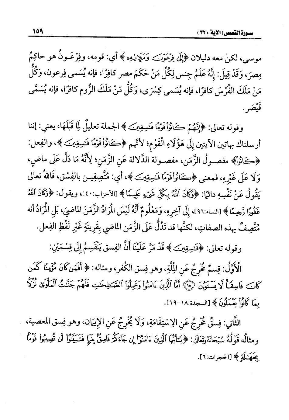 وقوله تعالى: {إِنَّهُمْ كَانُوا قَوْمًا فَاسِقِينَ} الجملة تعليلٌ لمَا قَبْلَهَا، يعني: إننا أرسلناك بهاتين الآيتين إِلَى هَؤُلَاءِ الْقَوْمِ؛ لأنَّهم {كَانُوا قَوْمًا فَاسِقِينَ}، والفِعل: {كَانُوا} مفصوُل الزَّمَن، مفصولة الدَّلالة عَنِ الزَّمَنِ؛ لِأَنَّهُ مَا دَلَّ عَلَى ماضٍ، وَلَا عَلَى غَيْرِهِ، فمعنى {كَانُوا قَوْمًا فَاسِقِينَ}، أي: مُتَّصِفِين بالفِسْق، فَاللَّهُ تعالى يَقُولُ عَنْ نَفْسِهِ دائمًا: {وَكَانَ اللَّهُ بِكُلِّ شَيْءٍ عَلِيمًا} [الأحزاب: ٤٠]، ويقول: {وَكَانَ اللَّهُ غَفُورًا رَحِيمًا} [النساء: ٩٦]، إِلَى آخِرِهِ، وَمَعْلُومٌ أَنَّهُ لَيْسَ المُرَادُ الزَّمَنَ الماضيَ، بَلِ المُرَادُ أنه مُتَّصِفٌ بهذه الصفاتِ، لكنَّها قد تَدُلُّ عَلَى الزَّمَن الماضي بِقَرِينَةٍ غَيْرِ لَفْظِ الفِعل.