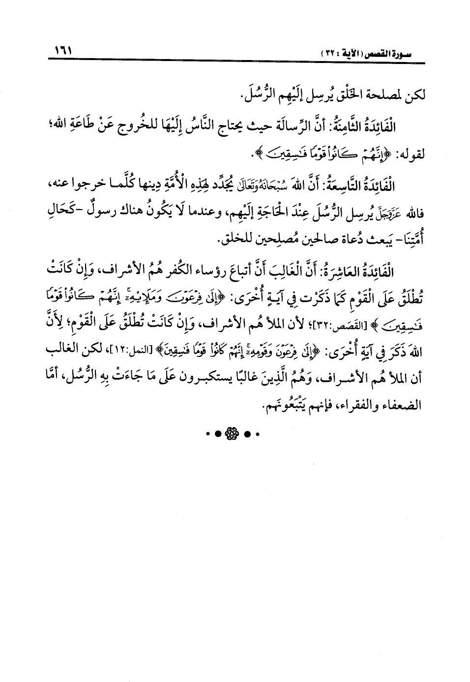 الْفَائِدَةُ العَاشِرَةُ: أَنَّ الْغَالِبَ أَنَّ أتباعَ رؤساء الكُفر هُمُ الأشراف، وَإِنْ كَانَتْ تُطْلَقُ عَلَى الْقَوْمِ كَمَا ذَكَرْت فِي آيَةٍ أُخْرَى: {إِلَى فِرْعَوْنَ وَمَلَئِهِ إِنَّهُمْ كَانُوا قَوْمًا فَاسِقِينَ} [القَصَص: ٣٢]؛ لأن الملأ هُم الأشراف، وَإِنْ كَانَتْ تُطْلَقُ عَلَى الْقَوْمِ؛ لِأَنَّ اللَّهَ ذَكَرَ فِي آيَةٍ أُخْرَى: {إِلَى فِرْعَوْنَ وَقَوْمِهِ إِنَّهُمْ كَانُوا قَوْمًا فَاسِقِينَ} [النمل: ١٢]، لكن الغالب أن الملأ هُم الأشراف، وَهُمُ الَّذِينَ غالبًا يستكبرون عَلَى مَا جَاءَتْ بِهِ الرُّسُل، أمَّا الضعفاء والفقراء، فإنهم يَتْبَعُونَهم.