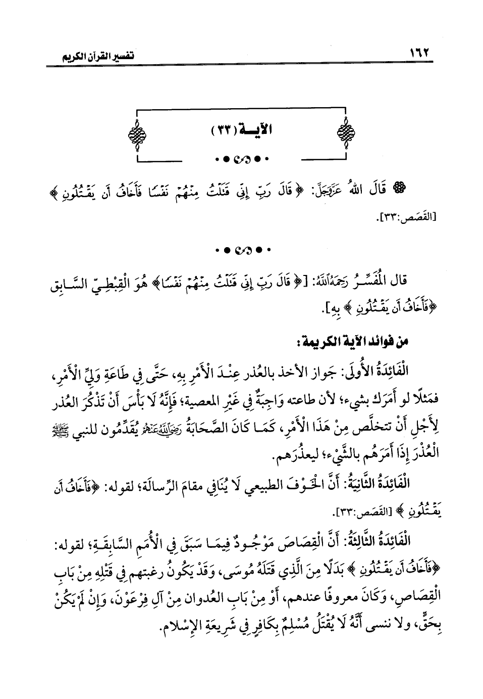 * قَالَ اللَّهُ عَزَّ وَجَلَّ: {قَالَ رَبِّ إِنِّي قَتَلْتُ مِنْهُمْ نَفْسًا فَأَخَافُ أَنْ يَقْتُلُونِ} [القصص: ٣٣].