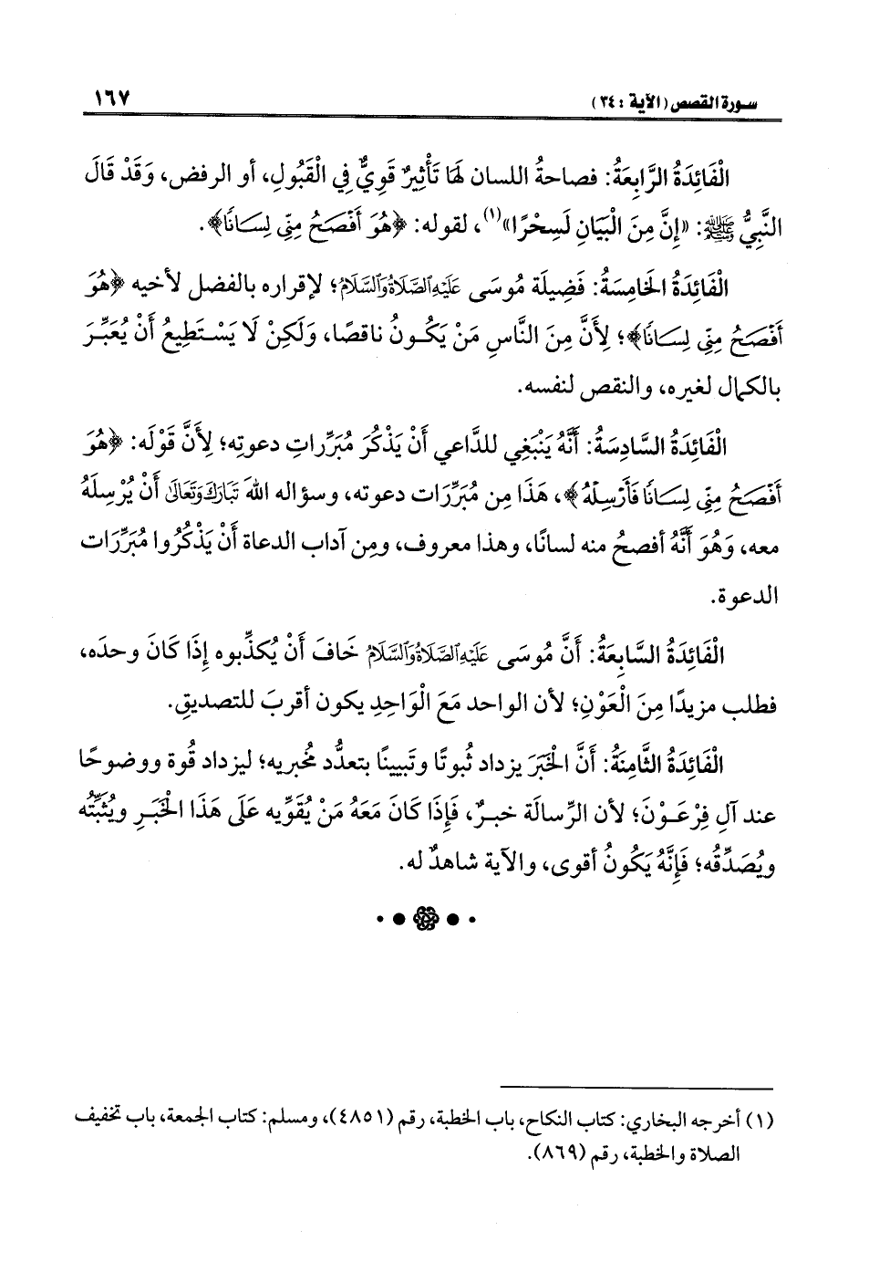 الْفَائِدَةُ الرَّابِعَةُ: فصاحةُ اللسان لَهَا تَأْثِيرٌ قَوِيٌّ فِي الْقَبُولِ، أو الرفض، وَقَدْ قَالَ النَّبِيُّ -صلى اللَّه عليه وسلم-: "إِنَّ مِنَ الْبَيَانِ لَسِحْرًا" (¬١)، لقوله: {هُوَ أَفْصَحُ مِنِّي لِسَانًا}.