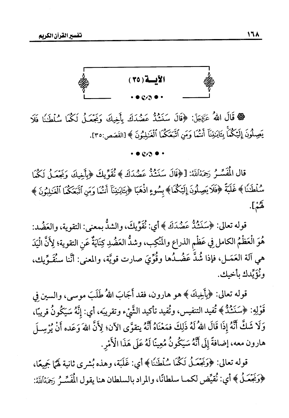 قال المُفَسِّرُ رَحِمَهُ اللَّهُ: [{قَالَ سَنَشُدُّ عَضُدَكَ} نُقَوِّيكَ {بِأَخِيكَ وَنَجْعَلُ لَكُمَا سُلْطَانًا} غَلَبَةً {فَلَا يَصِلُونَ إِلَيْكُمَا} بِسُوءٍ اذْهَبَا {بِآيَاتِنَا أَنْتُمَا وَمَنِ اتَّبَعَكُمَا الْغَالِبُونَ} لَهُمْ].
