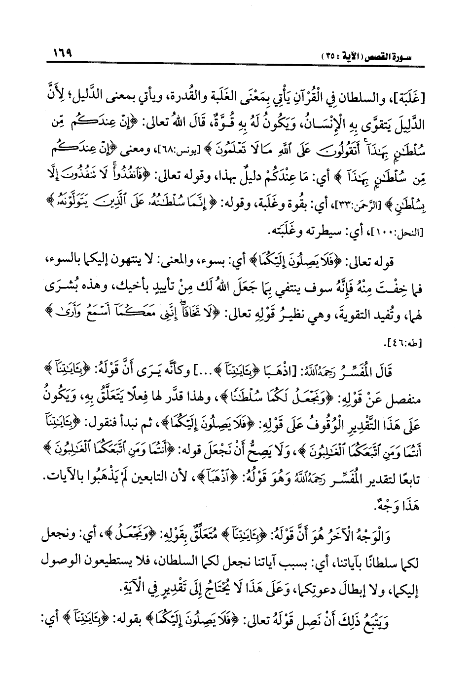 قَالَ المُفَسِّرُ رَحِمَهُ اللَّهُ: [اذْهَبَا {بِآيَاتِنَا}. . .] وكأنَّه يَرَى أَنَّ قَوْلَهُ: {بِآيَاتِنَا} منفصل عَنْ قَوْلِهِ: {وَنَجْعَلُ لَكُمَا سُلْطَانًا}، ولهذا قدَّر لها فِعلًا يَتَعَلَّقُ بِهِ، وَيَكُونُ عَلَى هَذَا التَّقْدِيرِ الْوُقُوفُ عَلَى قَوْلِهِ: {فَلَا يَصِلُونَ إِلَيْكُمَا}، ثم نبدأ فنقول: {بِآيَاتِنَا أَنْتُمَا وَمَنِ اتَّبَعَكُمَا الْغَالِبُونَ}، وَلَا يَصِحُّ أَنْ نَجْعَلَ قوله: {أَنْتُمَا وَمَنِ اتَّبَعَكُمَا الْغَالِبُونَ} تابعًا لتقدير المُفَسِّر رَحِمَهُ اللَّهُ وَهُوَ قَولهُ: {اذْهَبَا}؛ لأن التابعين لَمْ يَذْهَبُوا بالآيات. هَذَا وَجْهٌ.