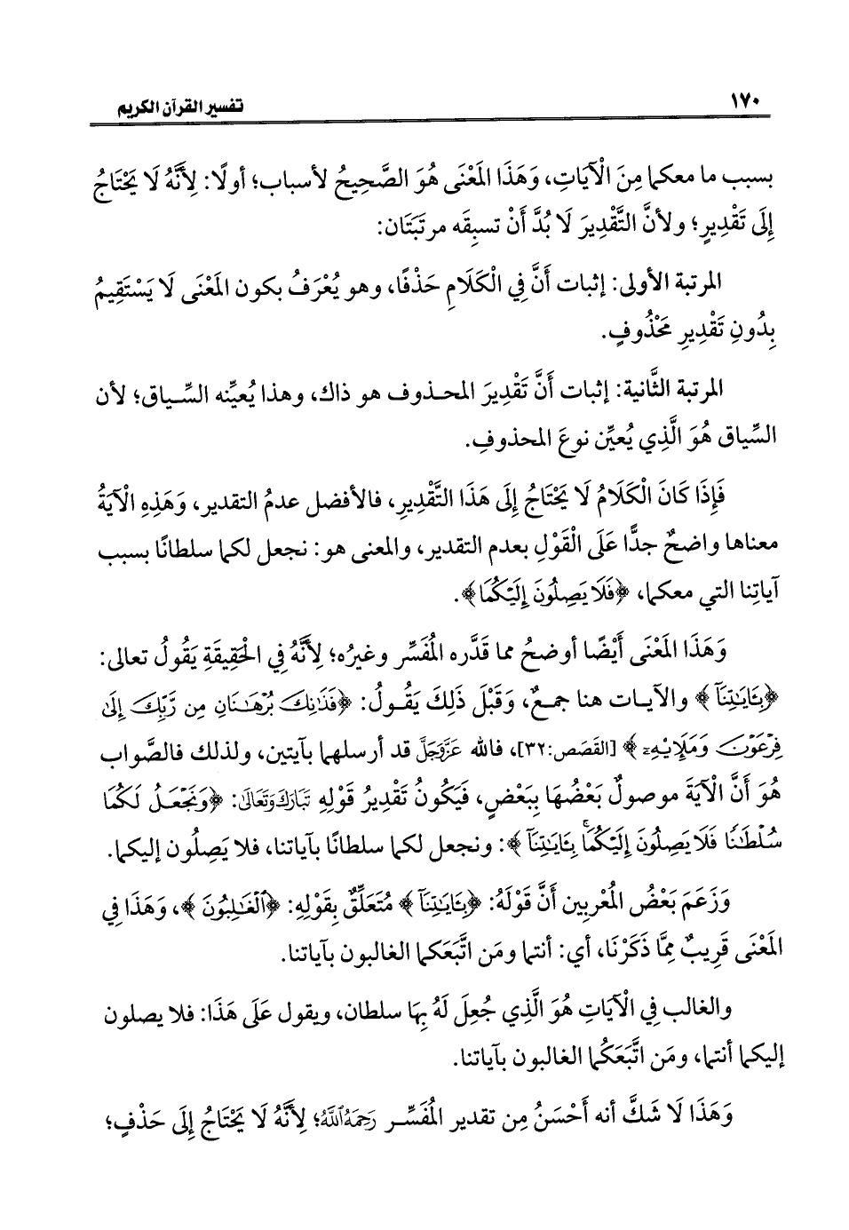 وَهَذَا المَعْنَى أَيْضًا أوضحُ مما قَدَّره المُفَسِّر وغيرُه؛ لِأَنَّهُ فِي الْحَقِيقَةِ يَقُولُ تعالى: {بِآيَاتِنَا} والآيات هنا جمعٌ، وَقَبْلَ ذَلِكَ يَقُولُ: {فَذَانِكَ بُرْهَانَانِ مِنْ رَبِّكَ إِلَى فِرْعَوْنَ وَمَلَئِهِ} [القَصَص: ٣٢]، فاللَّه عَزَّ وَجَلَّ قد أرسلهما بآيتين، ولذلك فالصَّواب هُوَ أَنَّ الآيَةَ موصولٌ بَعْضُهَا بِبَعْضٍ، فَيَكُونُ تَقْدِيرُ قَوْلِهِ تَبَارَكَ وَتَعَالَى: {وَنَجْعَلُ لَكُمَا سُلْطَانًا فَلَا يَصِلُونَ إِلَيْكُمَا بِآيَاتِنَا}: ونجعل لكما سلطانًا بآياتنا، فلا يَصِلُون إليكما.
