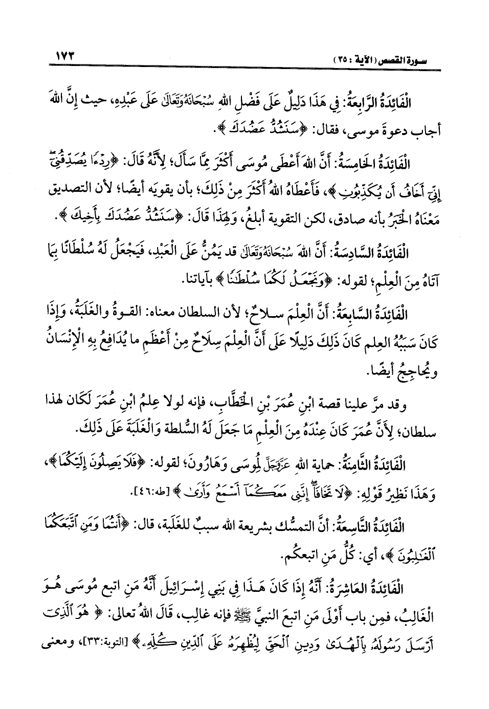 الْفَائِدَةُ الخَامِسَةُ: أَنَّ اللَّهَ أَعْطَى مُوسَى أَكْثَرَ مِمَّا سَأَل؛ لِأَنَّهُ قَالَ: {رِدْءًا يُصَدِّقُنِي إِنِّي أَخَافُ أَنْ يُكَذِّبُونِ}، فَأَعْطَاهُ اللَّهُ أَكْثَرَ مِنْ ذَلِكَ؛ بأن يقويَه أيضًا؛ لأن التصديق مَعْنَاهُ الْخَبَرُ بأنه صادق، لكن التقوية أبلغُ، وَلِهَذَا قَالَ: {سَنَشُدُّ عَضُدَكَ بِأَخِيكَ}.