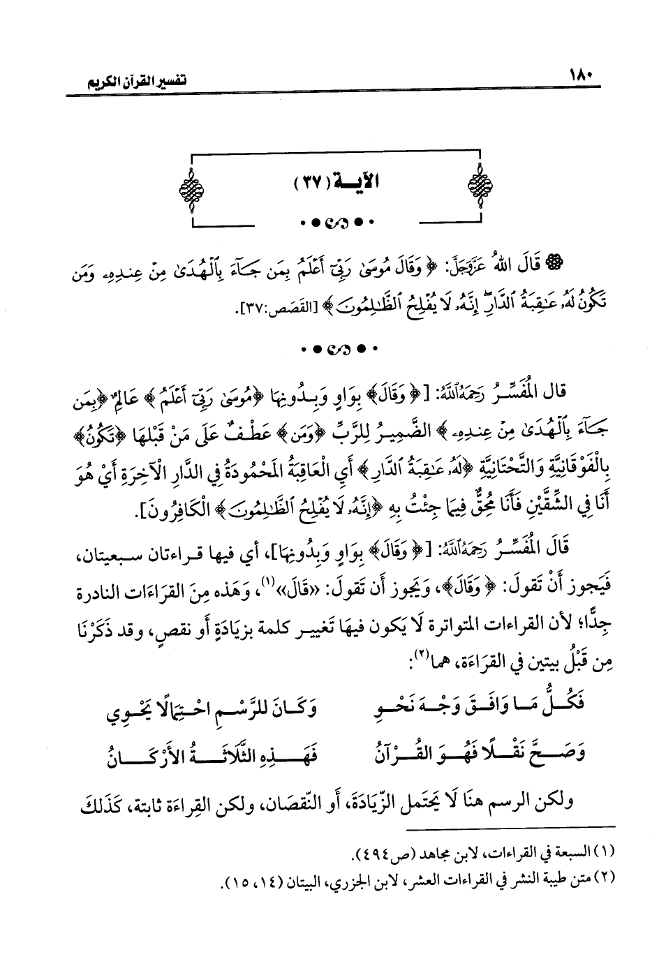 قَالَ المُفَسِّرُ رَحِمَهُ اللَّهُ: [{وَقَالَ} بِوَاوٍ وَبِدُونِهَا]، أي فيها قراءتان سبعيتان، فَيَجوز أَنْ تَقولَ: {وَقَالَ}، وَيَجوز أَن تَقولَ: "قَالَ" (¬١)، وَهَذه مِنَ القرَاءَات النادرة جِدًّا؛ لأن القراءات المتواترة لَا يَكون فيهَا تَغيير كلمة بزيَادَةٍ أَو نقصٍ، وقد ذَكَرْنَا مِن قَبْلُ بيتين في القرَاءَة، هما (¬٢):
