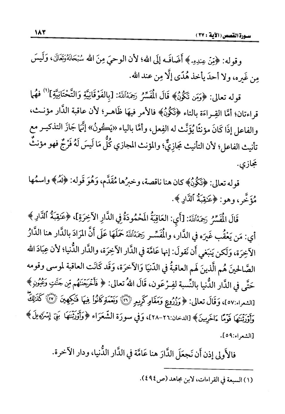 قَالَ المُفَسِّرُ رَحِمَهُ اللَّهُ: [أَي: العَاقِبَةُ المَحْمُودَةُ فِي الدَّارِ الآخِرَةِ]، {عَاقِبَةُ الدَّارِ} أي: مَن يَعْقُب غَيرَه في الدَّار، والمُفَسِّر رَحِمَهُ اللَّهُ حَمَلَهَا عَلَى أَنَّ المرَادَ بالدَّار هنا الدَّارُ الآخِرَة، وَلَكن يَنبَغي أَن نَقولَ: إنها عَامَّة في الدَّار الآخِرَة، والدَّار الدُّنيا؛ لأن عِبَادَ اللَّه الصَّالحينَ هُم الَّذينَ لَهم العاقبةُ في الدُّنيَا وَالآخرَة، وَقَد كَانَت العاقبة لموسى وقومه حَتَّى في الدَّار الدُّنيا بالنِّسبة لفِرْعَون، قَالَ اللَّهُ تعالى: {فَأَخْرَجْنَاهُمْ مِنْ جَنَّاتٍ وَعُيُونٍ} [الشعراء: ٥٧]، وَقَالَ تعالى: {وَزُرُوعٍ وَمَقَامٍ كَرِيمٍ (٢٦) وَنَعْمَةٍ كَانُوا فِيهَا فَاكِهِينَ (٢٧) كَذَلِكَ وَأَوْرَثْنَاهَا قَوْمًا آخَرِينَ} [الدخان: ٢٦ - ٢٨]، وَفي سورَة الشّعَرَاء {وَأَوْرَثْنَاهَا بَنِي إِسْرَائِيلَ} [الشعراء: ٥٩].
