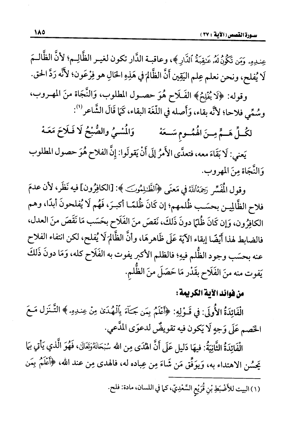 وقول المُفَسِّر رَحِمَهُ اللَّهُ في مَعنَى {الظَّالِمُونَ}: [الكافِرُون] فيه نَظَر؛ لأن عدمَ فلاح الظَّالمِين بحسَب ظُلمهم؛ إن كَانَ ظُلمًا أكبرَ، فَهُم لَا يُفلحونَ أبدًا، وهم الكافِرُون، وَإن كَانَ ظُلمًا دونَ ذَلكَ، نَقصَ منَ الفَلَاح بحَسَب مَا نَقَصَ منَ العدل، فالضابط لهذا أَيْضًا إبقاء الآيَة عَلَى ظَاهرهَا، وأنَّ الظَّالمَ لَا يُفلح، لكن انتفاء الفلاح عنه بحسَب وجود الظُّلم فيهِ؛ فالظلم الأكبر يفوت به الفَلَاح كله، وَمَا دونَ ذَلكَ يَفوت منه منَ الفَلَاح بقَدْر مَا حَصَلَ منَ الظُّلمِ.