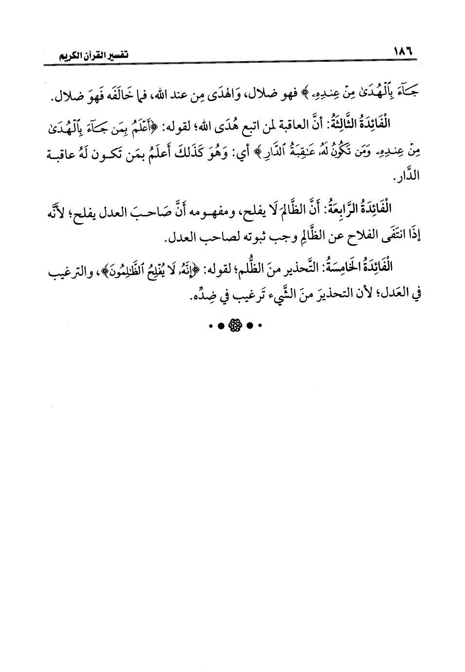 الْفَائِدَةُ الرَّابِعَةُ: أَنَّ الظَّالمَ لَا يفلح، ومفهومه أَنَّ صَاحبَ العدل يفلح؛ لأَنَّه إذَا انتَفَى الفلاح عن الظَّالِم وجب ثبوته لصاحب العدل.