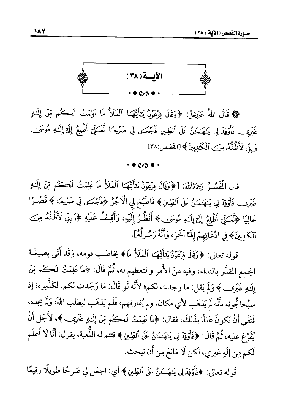 قال المُفَسِّرُ رَحِمَهُ اللَّهُ: [{وَقَالَ فِرْعَوْنُ يَاأَيُّهَا الْمَلَأُ مَا عَلِمْتُ لَكُمْ مِنْ إِلَهٍ غَيْرِي فَأَوْقِدْ لِي يَاهَامَانُ عَلَى الطِّينِ} فَاطْبُخْ لِي الْآجُرَّ {فَاجْعَلْ لِي صَرْحًا} قَصْرًا عَالِيًا {لَعَلِّي أَطَّلِعُ إِلَى إِلَهِ مُوسَى} أَنْظُرُ إِلَيْهِ، وَأَقِفُ عَلَيْهِ {وَإِنِّي لَأَظُنُّهُ مِنَ الْكَاذِبِينَ} فِي ادِّعَائِهِمْ إِلَهًا آخَرَ، وَأَنَّهُ رَسُولُهُ].
