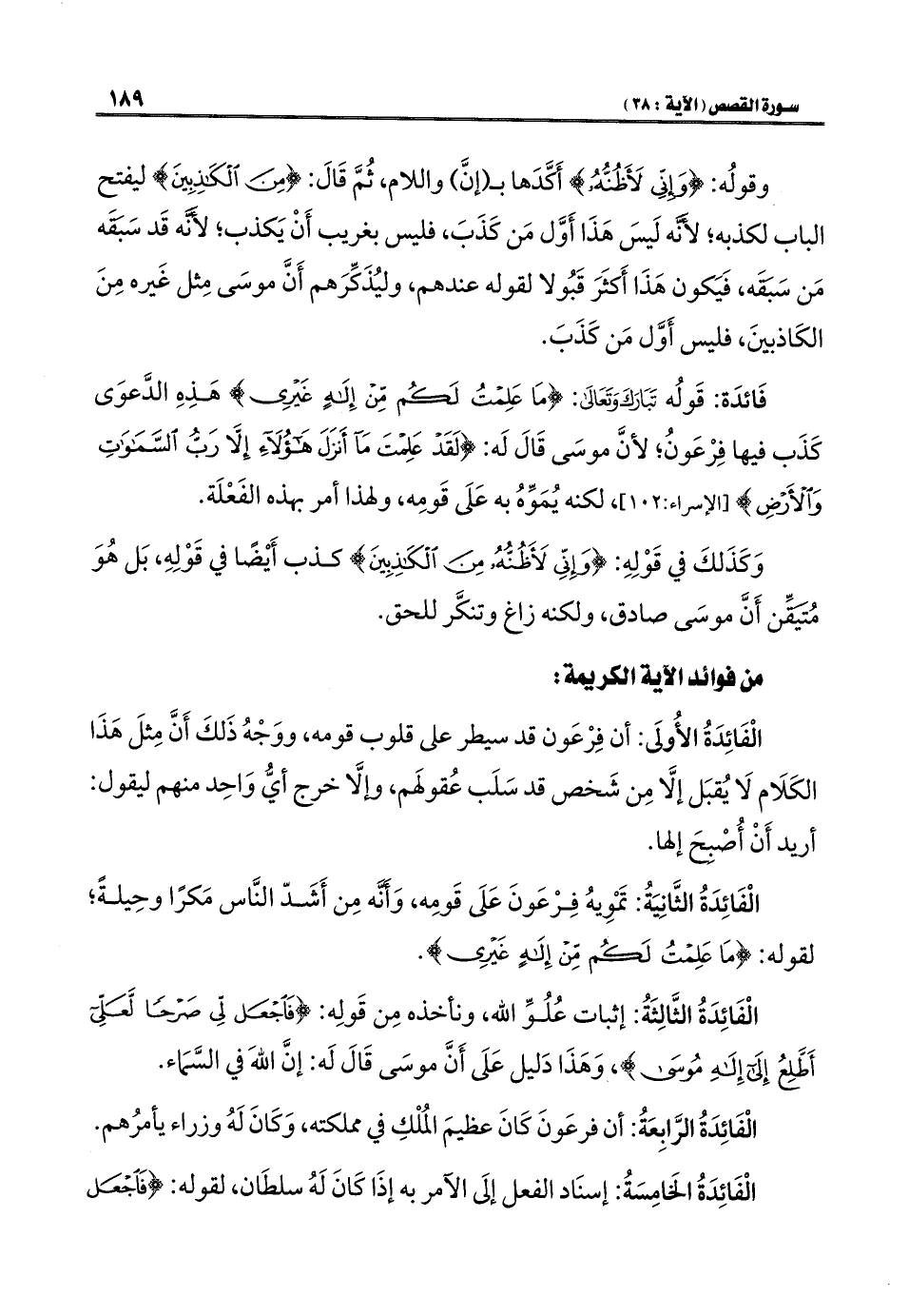 فَائدَة: قَوُله تَبَارَكَ وَتَعَالَى: {مَا عَلِمْتُ لَكُمْ مِنْ إِلَهٍ غَيْرِي} هَذِهِ الدَّعوَى كَذَب فيها فِرْعَونُ؛ لأنَّ موسَى قَالَ لَه: {قَالَ لَقَدْ عَلِمْتَ مَا أَنْزَلَ هَؤُلَاءِ إِلَّا رَبُّ السَّمَاوَاتِ وَالْأَرْضِ} [الإسراء: ١٠٢]، لكنه يُمَوِّهُ به عَلَى قَومِه، ولهذا أمر بهذه الفَعْلَة.