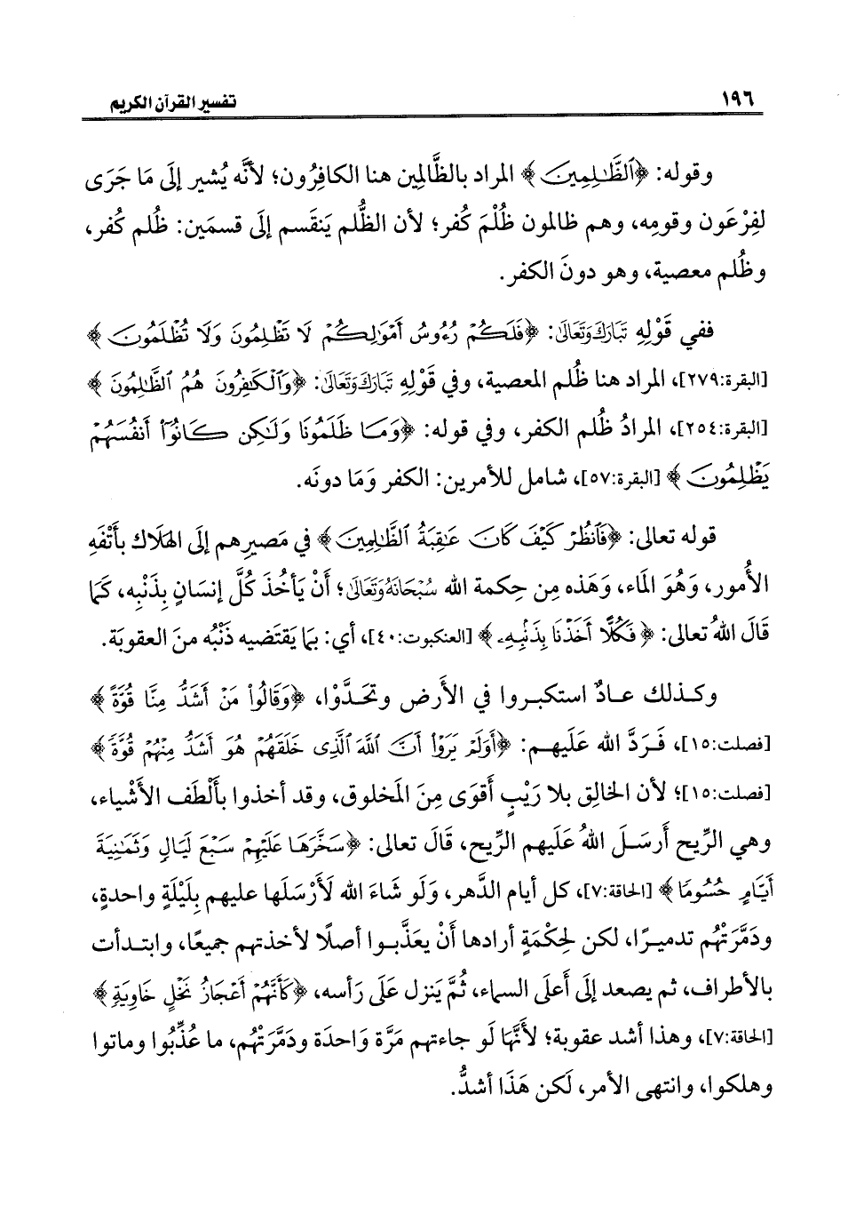 ففي قَوْلِهِ تَبَارَكَ وَتَعَالَى: {فَلَكُمْ رُءُوسُ أَمْوَالِكُمْ لَا تَظْلِمُونَ وَلَا تُظْلَمُونَ} [البقرة: ٢٧٩]، المراد هنا ظُلم المعصية، وفي قَوْلِهِ تَبَارَكَ وَتَعَالَى: {وَالْكَافِرُونَ هُمُ الظَّالِمُونَ} [البقرة: ٢٥٤]، المرادُ ظُلم الكفر، وفي قوله: {وَمَا ظَلَمُونَا وَلَكِنْ كَانُوا أَنْفُسَهُمْ يَظْلِمُونَ} [البقرة: ٥٧]، شامل للأمرين: الكفر وَمَا دونَه.