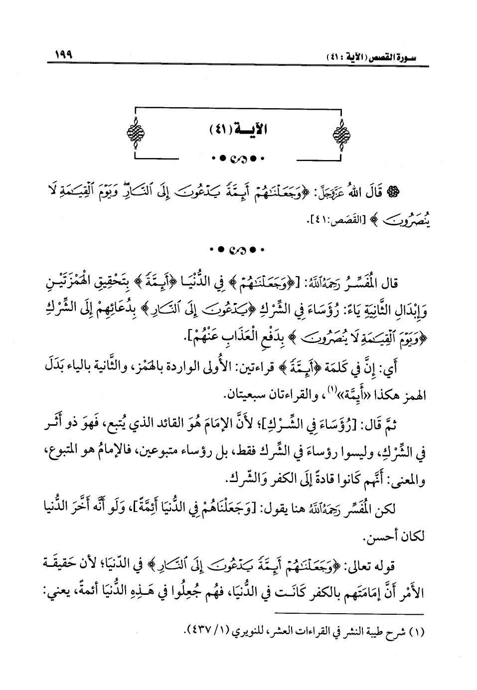 قال المُفَسِّرُ رَحِمَهُ اللَّهُ: [{وَجَعَلْنَاهُمْ} فِي الدُّنْيَا {أَئِمَّةً} بِتَحْقِيقِ الْهَمْزَتَيْنِ وَإِبْدَالِ الثَّانِيَةِ يَاءً: رُؤَسَاءَ فِي الشِّرْكِ {يَدْعُونَ إِلَى النَّارِ} بِدُعَائِهِمْ إِلَى الشِّرْكِ {وَيَوْمَ الْقِيَامَةِ لَا يُنْصَرُونَ} بِدَفْعِ الْعَذَابِ عَنْهُمْ].