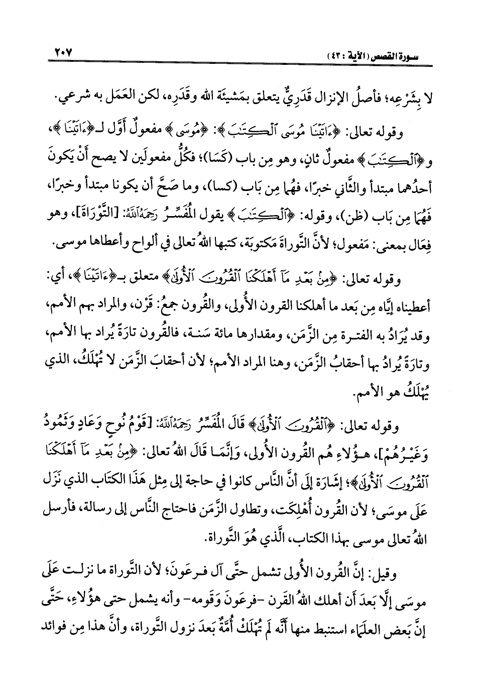 وقوله تعالى: {الْقُرُونَ الْأُولَى} قَالَ المُفَسِّرُ رَحِمَهُ اللَّهُ: [قَوْمُ نُوحٍ وَعَادٍ وَثَمُودُ وَغَيْرُهُمْ]، هؤُلاءِ هُم القُرون الأُولى، وَإنَّمَا قَالَ اللَّهُ تعالى: {مِنْ بَعْدِ مَا أَهْلَكْنَا الْقُرُونَ الْأُولَى}؛ إشَارَة إلَى أنَّ النَّاس كانوا في حاجة إلى مِثل هَذَا الكتَاب الذي نَزَل عَلَى موسَى؛ لأن القُرون أُهْلِكَت، وتطاول الزَّمَن فاحتاج النَّاس إلى رسالة، فأرسل اللَّهُ تعالى موسى بهذا الكتاب، الَّذي هُوَ التَّوراة.