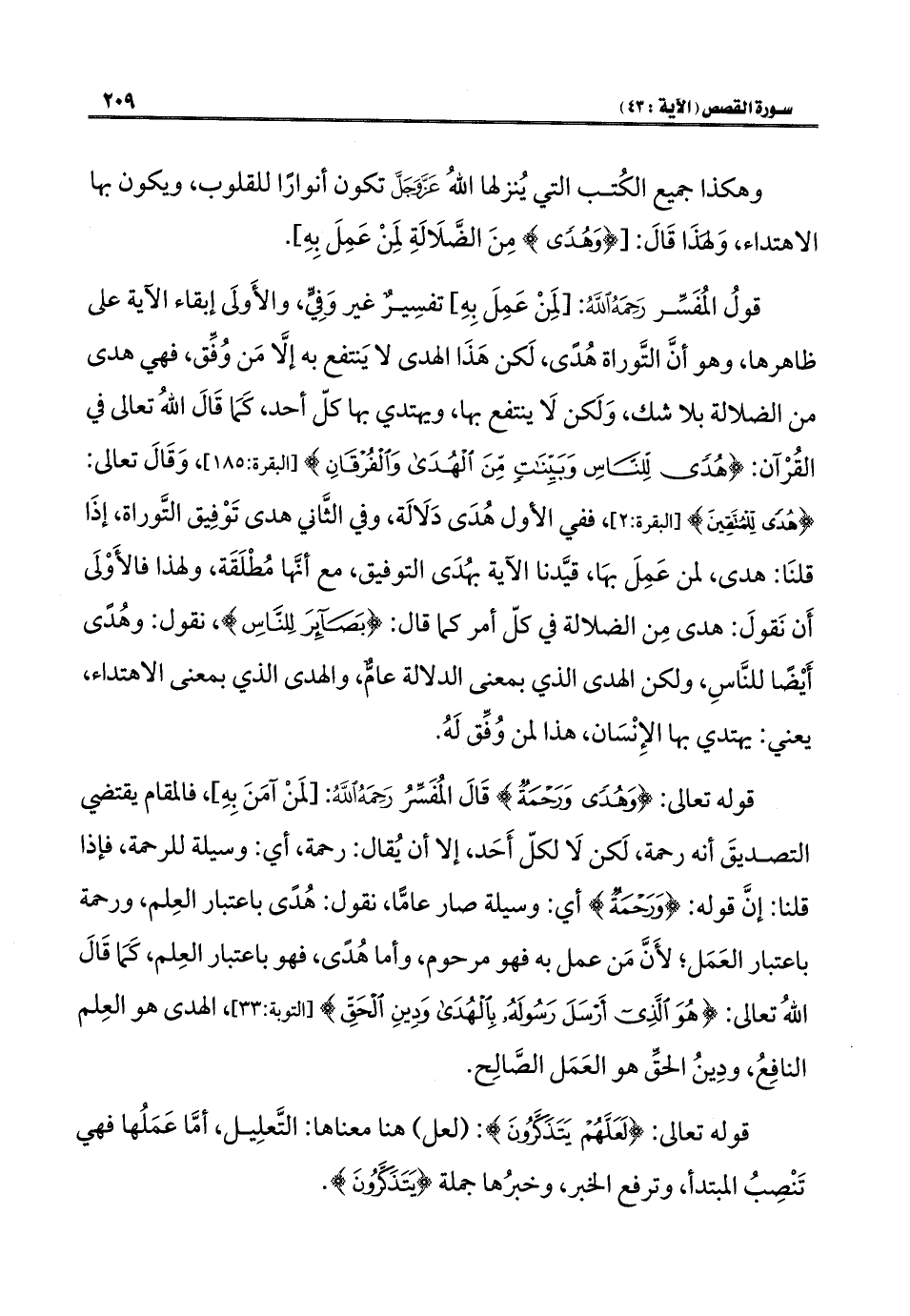 قوله تعالى: {وَهُدًى وَرَحْمَةٌ} قَالَ المُفَسِّرُ رَحِمَهُ اللَّهُ: [لمَنْ آمَنَ بِهِ]، فالمقام يقتضي التصديقَ أنه رحمة، لَكن لَا لكلّ أَحَد، إلا أن يُقال: رحمة، أي: وسيلة للرحمة، فإذا قلنا: إنَّ قوله: {وَرَحْمَةٌ} أي: وسيلة صار عامًّا، نقول: هُدًى باعتبار العِلم، ورحمة باعتبار العَمَل؛ لأَنَّ مَن عمل به فهو مرحوم، وأما هُدًى، فهو باعتبار العِلم، كَمَا قَالَ اللَّهُ تعالى: {هُوَ الَّذِي أَرْسَلَ رَسُولَهُ بِالْهُدَى وَدِينِ الْحَقِّ} [التوبة: ٣٣]، الهدى هو العِلم النافِعُ، ودِينُ الحقِّ هو العَمَل الصَّالِح.
