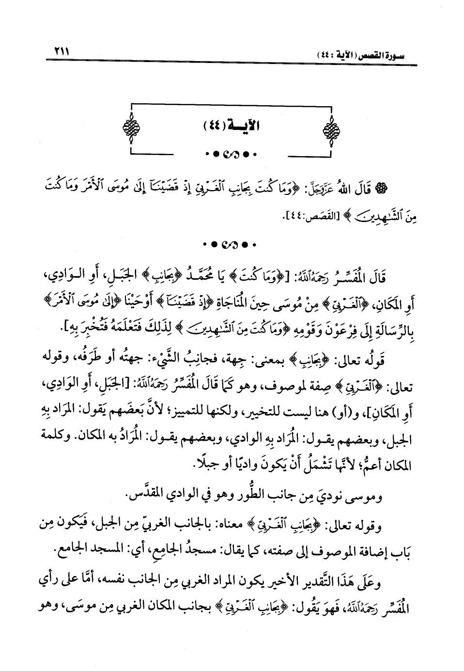 قَالَ المُفَسِّرُ رَحِمَهُ اللَّهُ: [{وَمَا كُنْتَ} يَا مُحَمَّدُ {بِجَانِبِ} الجَبَلِ، أَوِ الوَادِي، أَوِ المَكَانِ، {الْغَرْبِيِّ} مِنْ مُوسَى حِينَ المناجَاةِ {إِذْ قَضَيْنَا} أَوْحَيْنَا {إِلَى مُوسَى الْأَمْرَ} بِالرِّسَالَةِ إِلَى فِرْعَوْنَ وَقَوْمِهِ {وَمَا كُنْتَ مِنَ الشَّاهِدِينَ} لِذَلِكَ فتعْلَمَهُ فَتُخْبِرَ بِهِ].