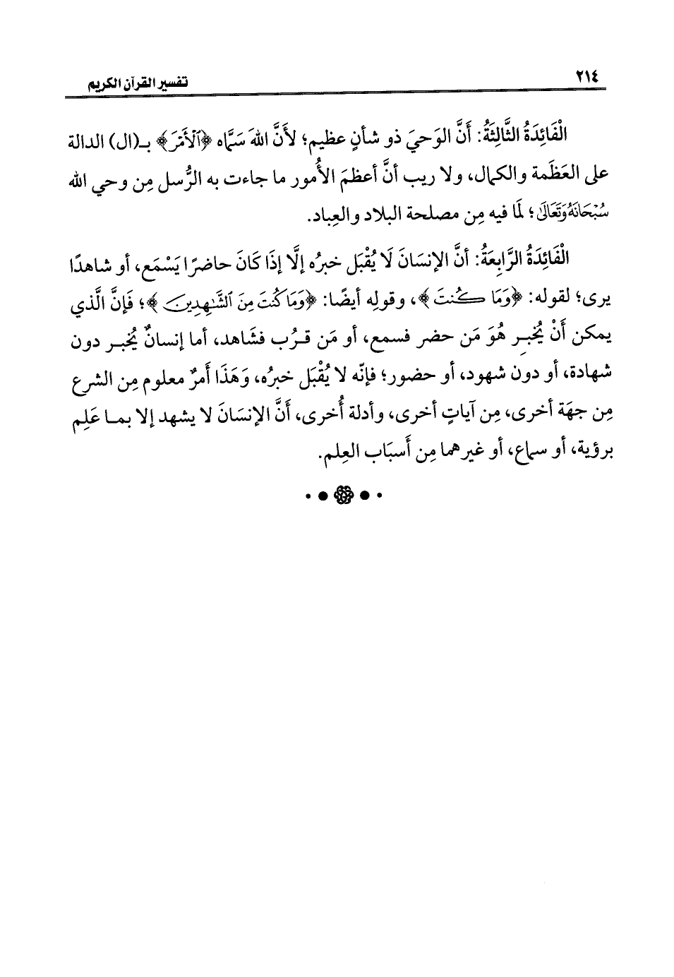 الْفَائِدَةُ الرَّابِعَةُ: أنَّ الإنسَانَ لَا يُقْبَل خبرُه إلَّا إذَا كَانَ حاضرًا يَسْمَع، أو شاهدًا يرى؛ لقوله: {وَمَا كُنْتَ}، وقولِه أيضًا: {وَمَا كُنْتَ مِنَ الشَّاهِدِينَ}؛ فَإنَّ الَّذي يمكن أَنْ يُخبِر هُوَ مَن حضر فسمع، أو مَن قرُب فشَاهد، أما إنسانٌ يُخبر دون شهادة، أو دون شهود، أو حضور؛ فإنّه لا يُقْبَل خبرُه، وَهَذَا أَمرٌ معلوم مِن الشرع مِن جهَة أخرى، مِن آياتٍ أخرى، وأدلة أُخرى، أَنَّ الإنسَانَ لا يشهد إلا بما عَلِم برؤية، أو سماع، أو غيرهما مِن أَسبَاب العِلم.