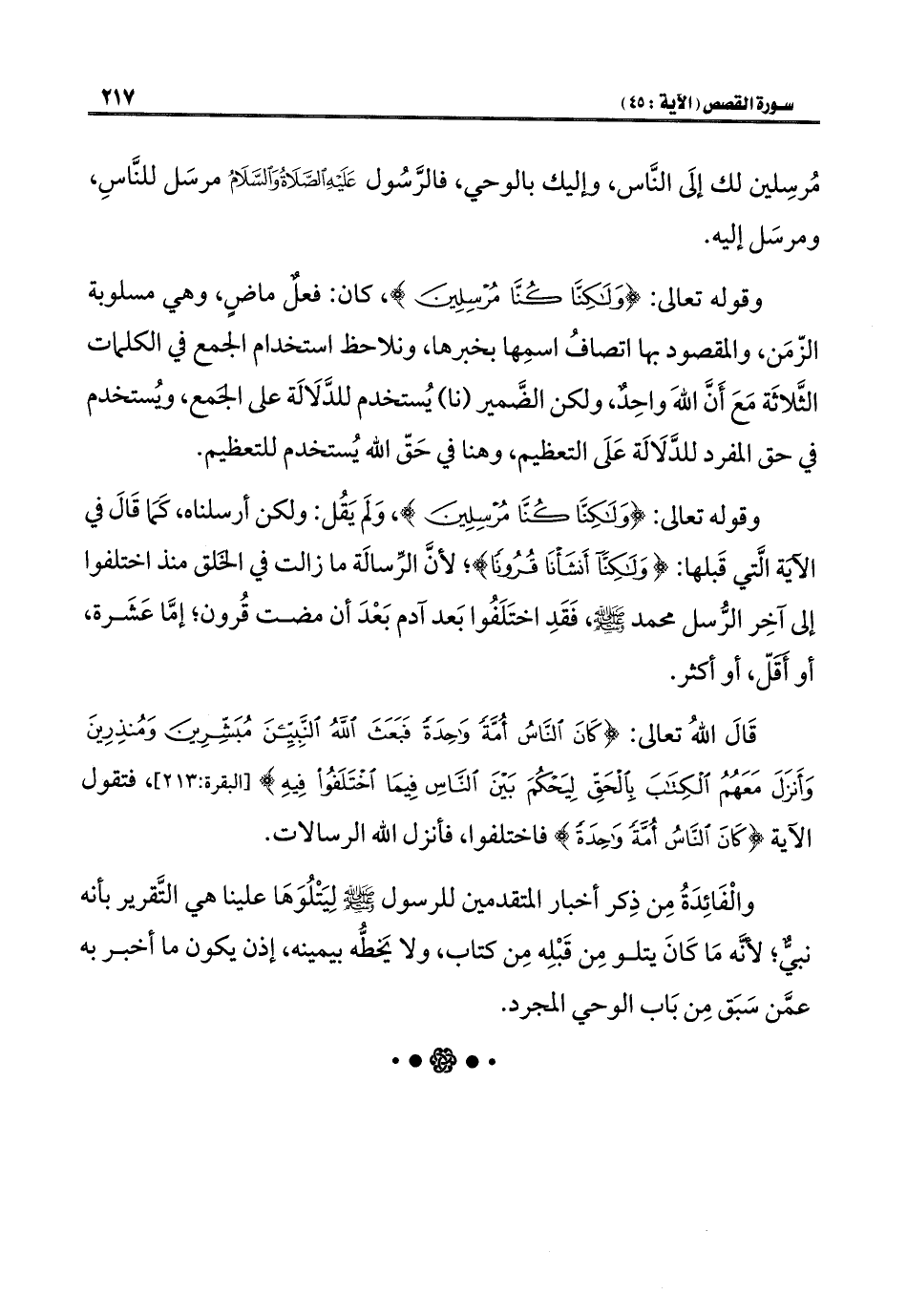 وقوله تعالى: {وَلَكِنَّا كُنَّا مُرْسِلِينَ}، وَلَم يَقُل: ولكن أرسلناه، كَمَا قَالَ في الآية الَّتي قَبلها: {وَلَكِنَّا أَنْشَأْنَا قُرُونًا}؛ لأنَّ الرِّسالَة ما زالت في الخَلق منذ اختلفوا إلى آخِر الرُّسل محمد -صلى اللَّه عليه وسلم-، فَقَدِ اختَلَفُوا بَعد آدم بَعْدَ أن مضت قُرون؛ إمَّا عَشَرة، أو أَقَلّ، أو أكثر.