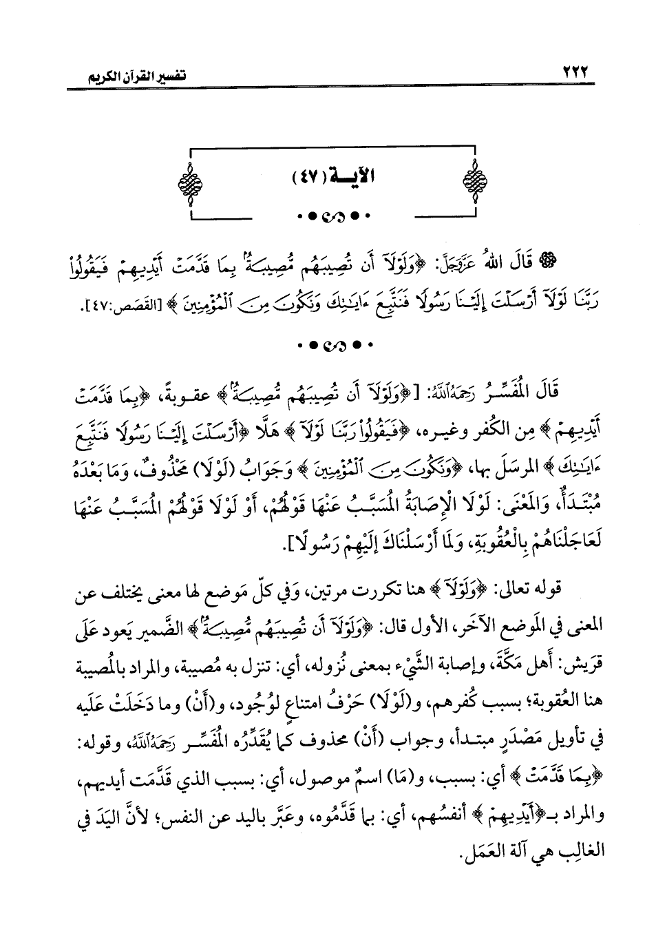 قوله تعالى: {وَلَوْلَا} هنا تكررت مرتين، وَفي كلّ مَوضع لها معنى يختلف عن المعنى في المَوضع الآخَر، الأول قال: {وَلَوْلَا أَنْ تُصِيبَهُمْ مُصِيبَةٌ} الضَّمير يَعود عَلَى قرَيش: أَهل مَكَّةَ، وإصابة الشَّيْء بمعنى نُزوله، أي: تنزل به مُصيبة، والمراد بالمُصيبة هنا العُقوبة؛ بسبب كُفرهم، و (لَوْلَا) حَرْفُ امتناعٍ لوُجُود، و (أَنْ) وما دَخَلَتْ عَلَيه في تأويل مَصْدَرٍ مبتدأ، وجواب (أَنْ) محذوف كما يُقَدِّرُه المُفَسِّر رَحِمَهُ اللَّهُ، وقوله: {بِمَا قَدَّمَتْ} أي: بسبب، و (مَا) اسمٌ موصول، أي: بسبب الذي قَدَّمَت أيديهم، والمراد بـ {أَيْدِيهِمْ} أنفسُهم، أي: بما قَدَّمُوه، وعَبَّر باليد عن النفس؛ لأنَّ اليَدَ في الغالِب هي آلة العَمَل.