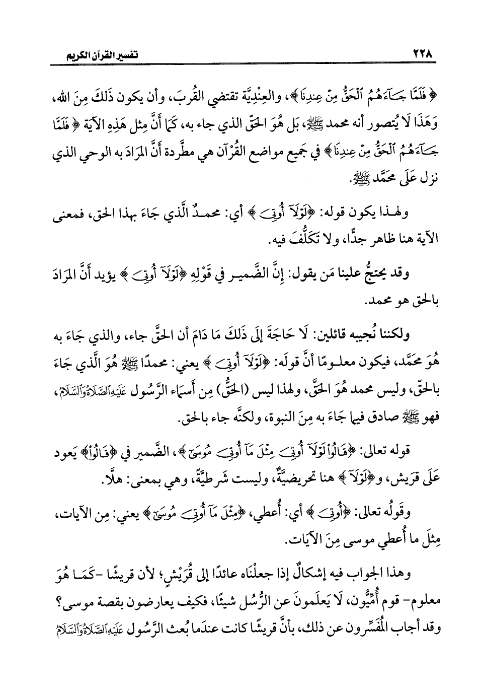 ولكننا نُجيبه قائلين: لَا حَاجَةَ إلَى ذَلكَ مَا دَامَ أن الحقَّ جاء، والذي جَاءَ به هُوَ محَمَّد، فيكون معلومًا أنَّ قولَه: {لَوْلَا أُوتِيَ} يعني: محمدًا -صلى اللَّه عليه وسلم- هُوَ الَّذي جَاءَ بالحقّ، وليس محمد هُوَ الحَقَّ، ولهذا ليس (الحَقُّ) مِن أَسمَاء الرَّسُول عَلَيْهِ الصَّلَاةُ وَالسَّلَامُ، فهو -صلى اللَّه عليه وسلم- صادق فيما جَاءَ به مِنَ النبوة، ولكنَّه جاء بالحق.