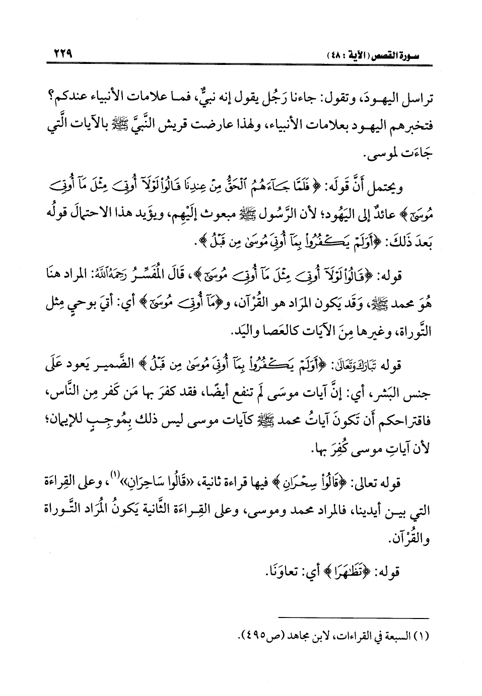 قوله تعالى: {قَالُوا سِحْرَانِ} فيها قراءة ثانية، "قَالُوا سَاحِرَانِ" (¬١)، وعلى القِراءَة التي بين أيدينا، فالمراد محمد وموسى، وعلى القِراءَة الثَّانية يَكونُ المُرَاد التَّوراة والقُرْآن.