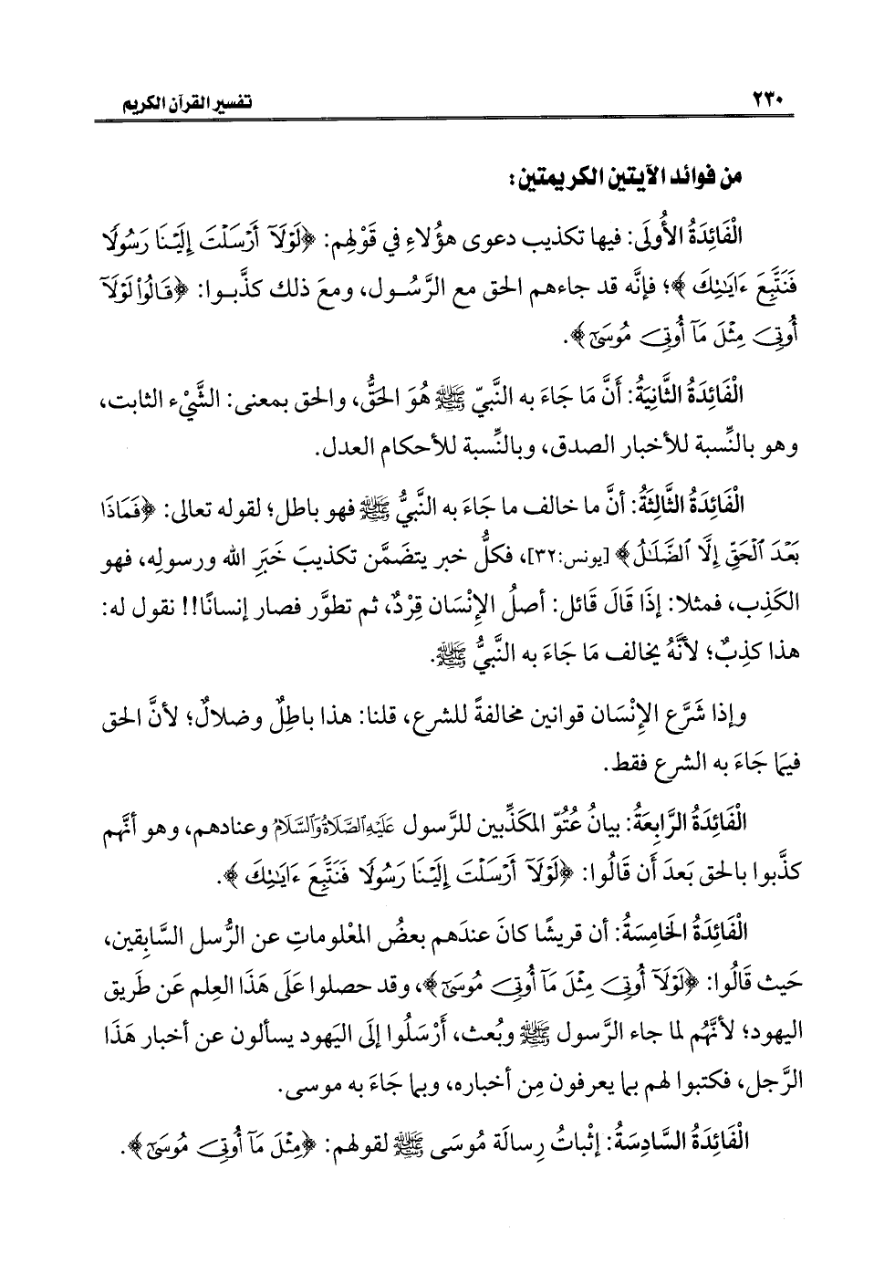 الْفَائِدَةُ الأُولَى: فيها تكذيب دعوى هؤُلاءِ في قَوْلِهم: {لَوْلَا أَرْسَلْتَ إِلَيْنَا رَسُولًا فَنَتَّبِعَ آيَاتِكَ}؛ فإنَّه قد جاءهم الحق مع الرَّسُول، ومعَ ذلك كذَّبوا: {قَالُوا لَوْلَا أُوتِيَ مِثْلَ مَا أُوتِيَ مُوسَى}.