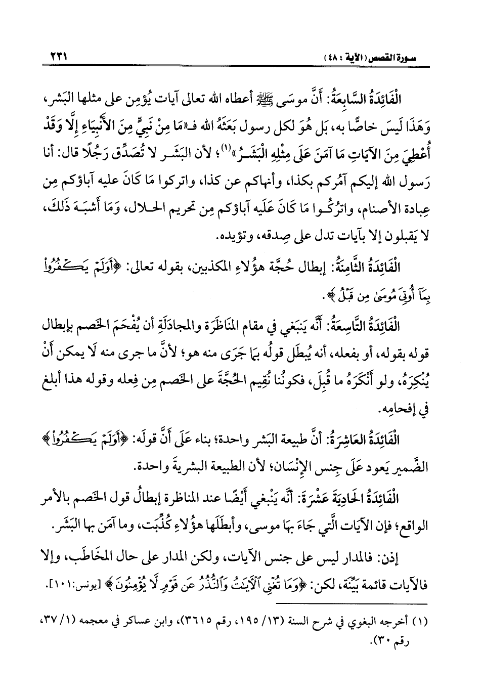الْفَائِدَةُ الحَادِيَةَ عَشْرَةَ: أنَّه يَنْبغي أَيْضًا عند المناظرة إبطالُ قول الخَصم بالأمر الواقع؛ فإن الآيات الَّتي جَاءَ بهَا موسى، وأبطَلَها هؤُلاءِ كُذِّبَت، وما آمَن بها البَشَر.