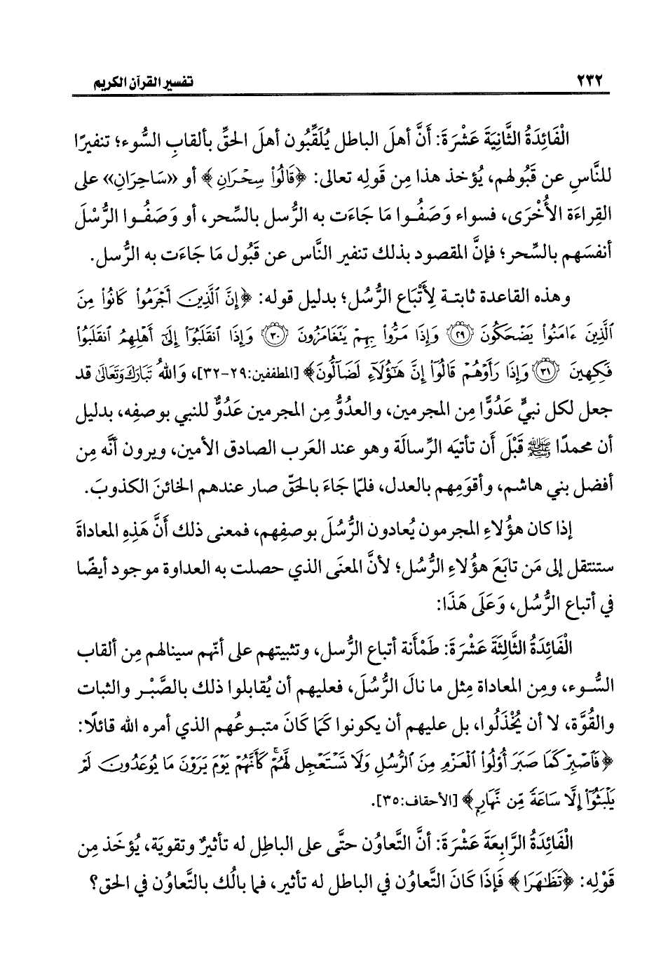 الْفَائِدَةُ الثَّالِثَةَ عَشْرَةَ: طَمْأَنة أتباع الرُّسل، وتثبيتهم على أنّهم سينالهم مِن ألقاب السُّوء، ومن المعاداة مِثل ما نالَ الرُّسُلَ، فعليهم أن يُقابلوا ذلك بالصَّبْر والثبات والقُوَّة، لا أن يُخْذَلُوا، بل عليهم أن يكونوا كَمَا كَانَ متبوعُهم الذي أمره اللَّه قائلًا: {فَاصْبِرْ كَمَا صَبَرَ أُولُو الْعَزْمِ مِنَ الرُّسُلِ وَلَا تَسْتَعْجِلْ لَهُمْ كَأَنَّهُمْ يَوْمَ يَرَوْنَ مَا يُوعَدُونَ لَمْ يَلْبَثُوا إِلَّا سَاعَةً مِنْ نَهَارٍ} [الأحقاف: ٣٥].