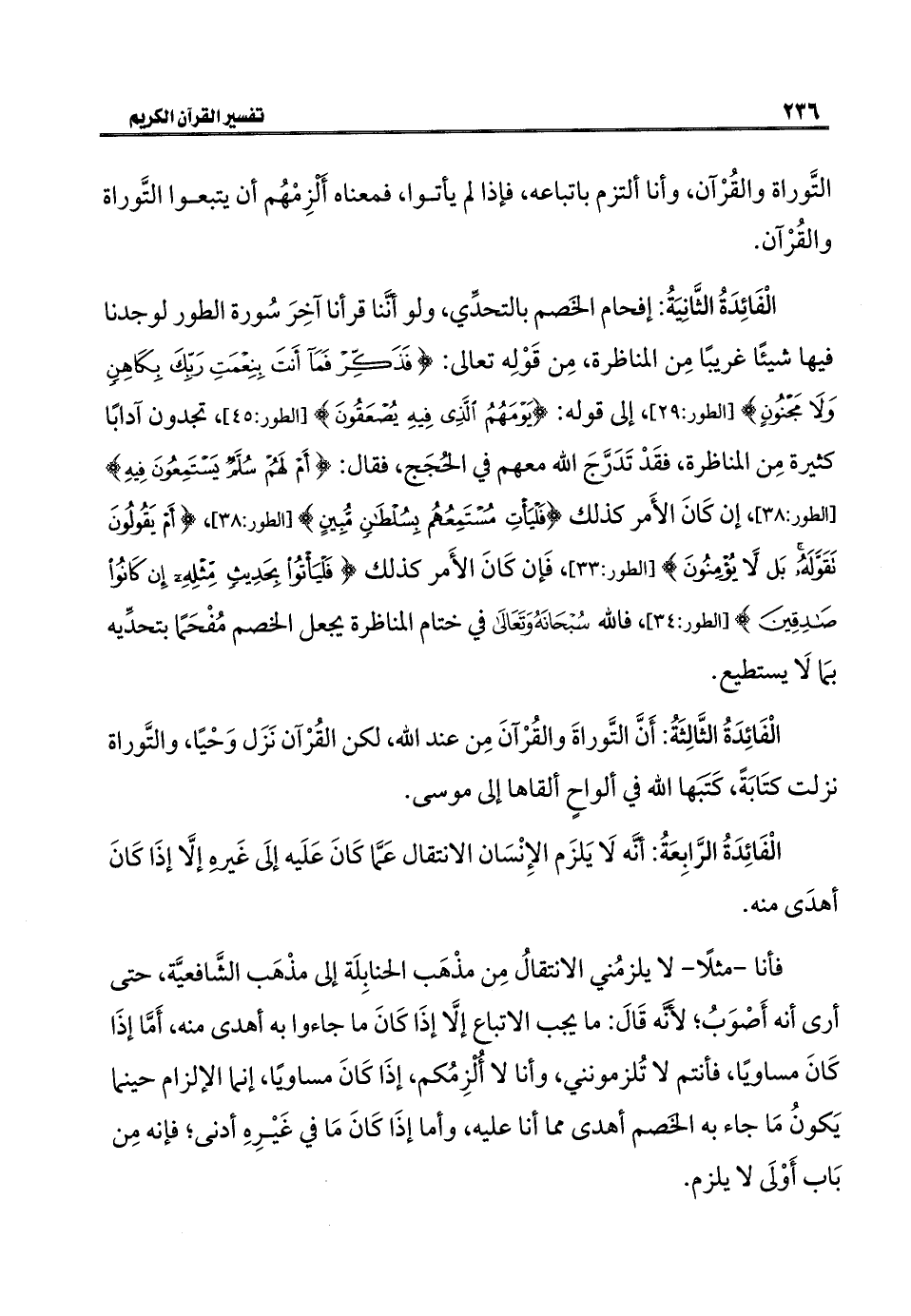 الْفَائِدَةُ الثَّانِيَةُ: إفحام الخَصم بالتحدِّي، ولو أنَّنا قرأنا آخِرَ سُورة الطور لوجدنا فيها شيئًا غريبًا مِن المناظرة، مِن قَوْلِه تعالى: {فَذَكِّرْ فَمَا أَنْتَ بِنِعْمَتِ رَبِّكَ بِكَاهِنٍ وَلَا مَجْنُونٍ} [الطور: ٢٩]، إلى قوله: {يَوْمَهُمُ الَّذِي فِيهِ يُصْعَقُونَ} [الطور: ٤٥]، تجدون آدابًا كثيرة مِن المناظرة، فقَدْ تَدَرَّجَ اللَّه معهم في الحُجَج، فقال: {أَمْ لَهُمْ سُلَّمٌ يَسْتَمِعُونَ فِيهِ} [الطور: ٣٨]، إن كَانَ الأَمر كذلك {فَلْيَأْتِ مُسْتَمِعُهُمْ بِسُلْطَانٍ مُبِينٍ} [الطور: ٣٨]، {أَمْ يَقُولُونَ تَقَوَّلَهُ بَلْ لَا يُؤْمِنُونَ} [الطور: ٣٣]، فَإن كَانَ الأَمر كذلك {فَلْيَأْتُوا بِحَدِيثٍ مِثْلِهِ إِنْ كَانُوا صَادِقِينَ} [الطور: ٣٤]، فاللَّه سُبْحَانَهُ وَتَعَالَى في ختام المناظرة يجعل الخصم مُفْحَمًا بتحدِّيه بمَا لَا يستطيع.