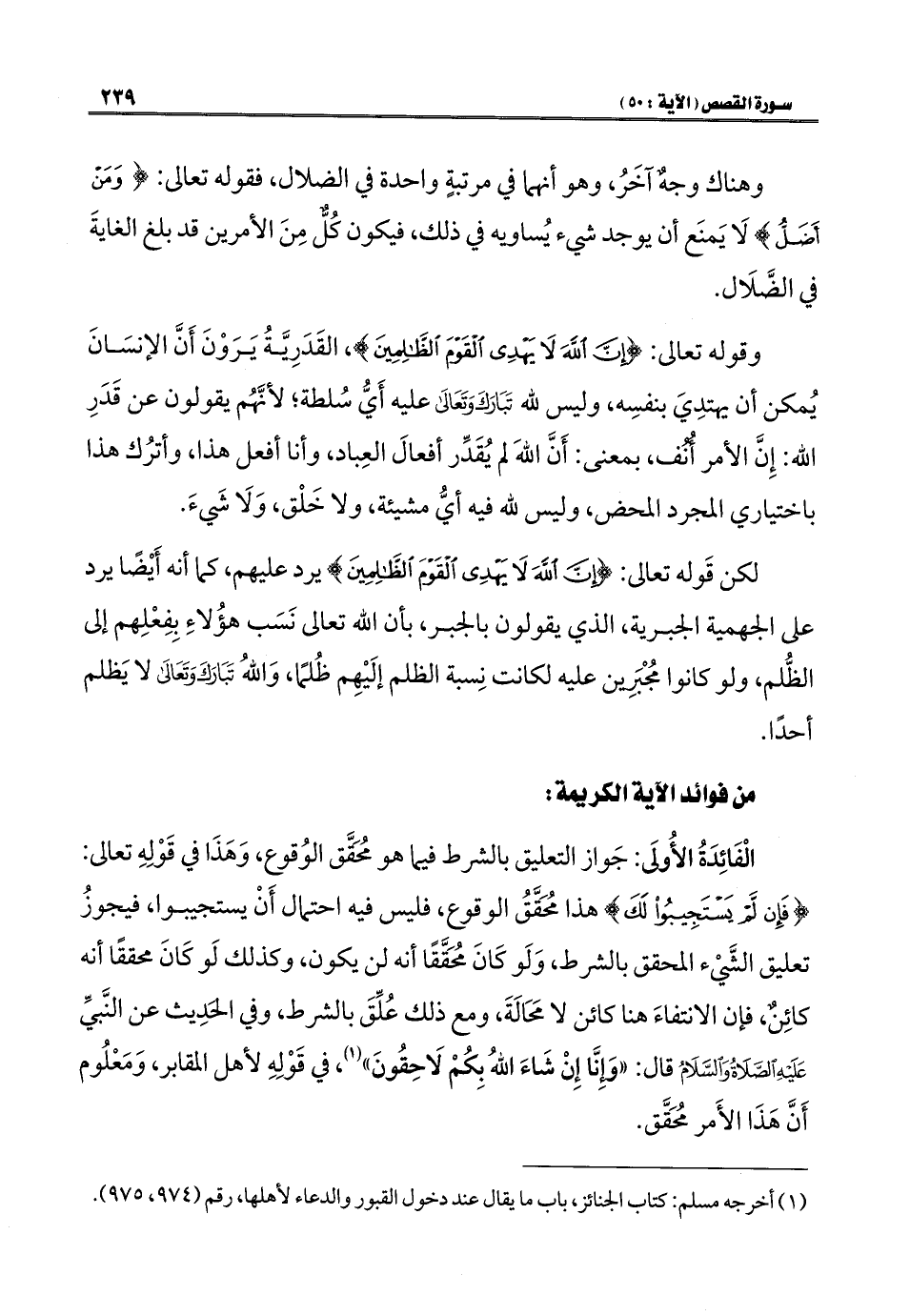 وقوله تعالى: {إِنَّ اللَّهَ لَا يَهْدِي الْقَوْمَ الظَّالِمِينَ}، القَدَرِيَّةُ يَرَوْنَ أَنَّ الإنسَانَ يُمكن أن يهتدِيَ بنفسِه، وليس للَّه تَبَارَكَ وَتَعَالَى عليه أَيُّ سُلطة؛ لأنَّهُم يقولون عن قَدَرِ اللَّه: إِنَّ الأمر أُنُف، بمعنى: أَنَّ اللَّهَ لم يُقَدِّر أفعالَ العِباد، وأنا أفعل هذا، وأترُك هذا باختياري المجرد المحض، وليس للَّه فيه أيُّ مشيئة، ولا خَلْق، وَلَا شَيءَ.