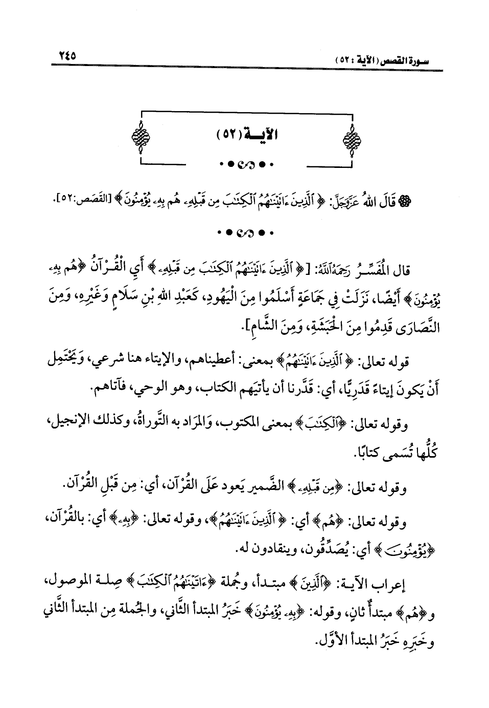 * قَالَ اللَّهُ عَزَّ وَجَلَّ: {الَّذِينَ آتَيْنَاهُمُ الْكِتَابَ مِنْ قَبْلِهِ هُمْ بِهِ يُؤْمِنُونَ} [القصص: ٥٢].