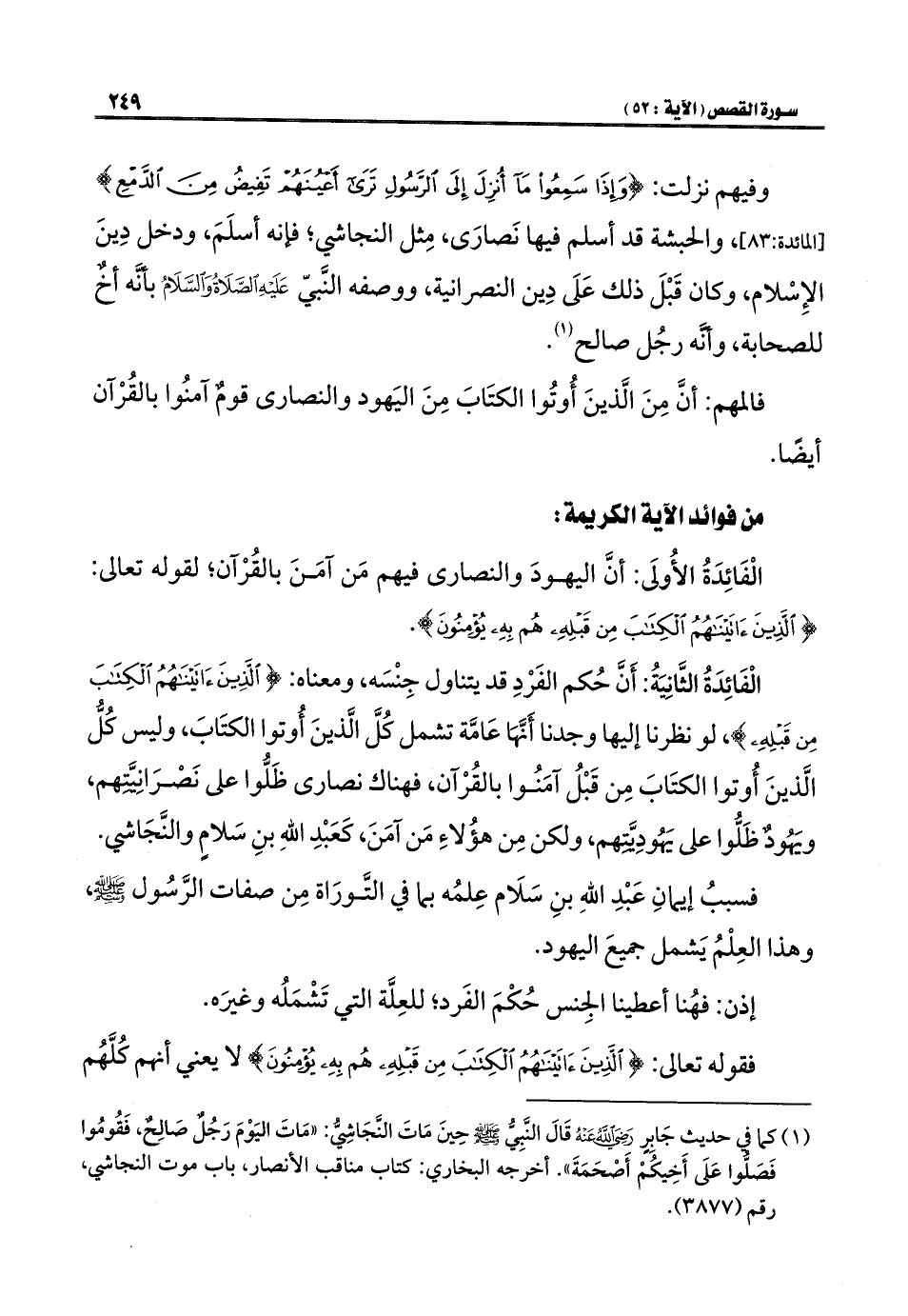 وفيهم نزلت: {وَإِذَا سَمِعُوا مَا أُنْزِلَ إِلَى الرَّسُولِ تَرَى أَعْيُنَهُمْ تَفِيضُ مِنَ الدَّمْعِ} [المائدة: ٨٣]، والحبشة قد أسلم فيها نَصارَى، مِثل النجاشي؛ فإنه أسلَمَ، ودخل دِينَ الإِسْلام، وكان قَبْلَ ذلك عَلَى دِين النصرانية، ووصفه النَّبيّ عَلَيْهِ الصَّلَاةُ وَالسَّلَامُ بأنَّه أخٌ للصحابة، وأنَّه رجُل صالح (¬١).