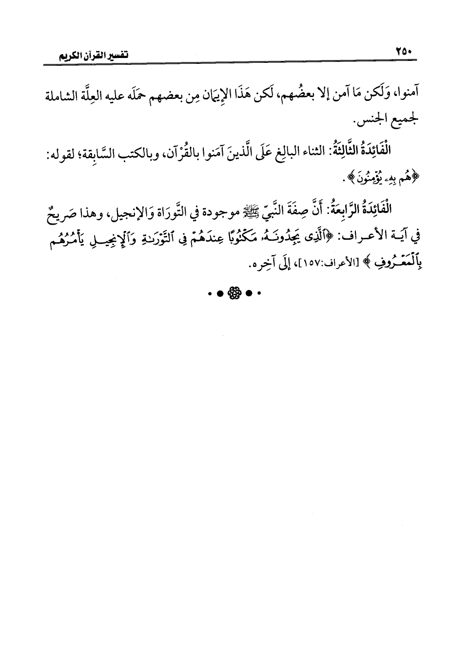 الْفَائِدَةُ الثَّالِثَةُ: الثناء البالِغ عَلَى الَّذينَ آمَنوا بالقُرْآن، وبالكتب السَّابقة؛ لقوله: {هُمْ بِهِ يُؤْمِنُونَ}.