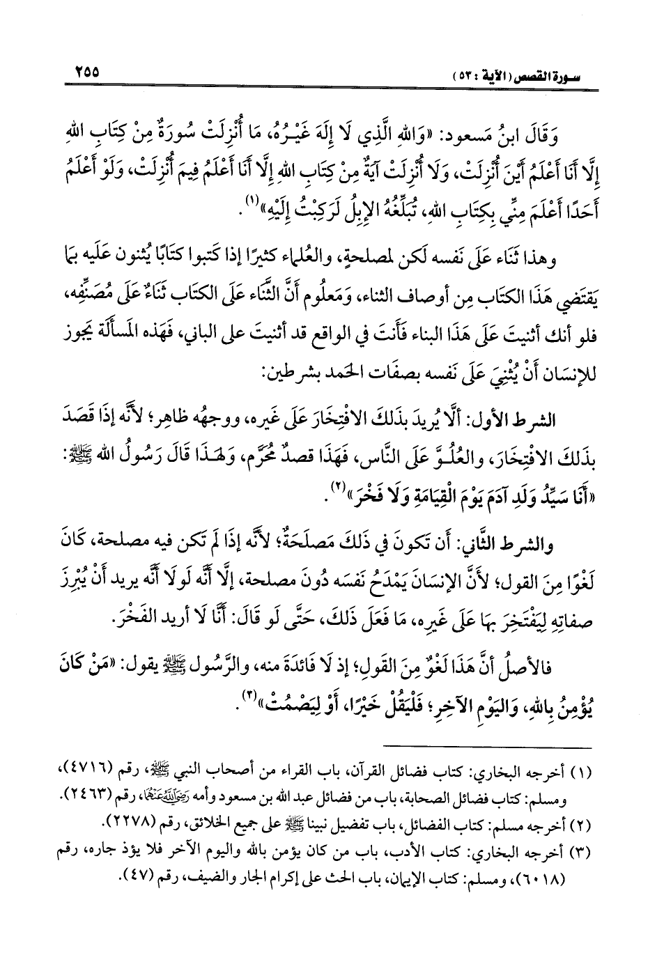 الشرط الأول: ألَّا يُريدَ بذَلكَ الافْتِخَارَ عَلَى غَيره، ووجهُه ظاهِر؛ لأَنَّه إذَا قَصَدَ بذَلكَ الافْتِخَارَ، والعُلُوَّ عَلَى النَّاس، فَهَذَا قصدٌ مُحَرَّم، وَلهَذَا قَالَ رَسُولُ اللَّه -صلى اللَّه عليه وسلم-: "أَنَا سَيِّدُ وَلَدِ آدَمَ يَوْمَ الْقِيَامَةِ وَلَا فَخْرَ" (¬٢).