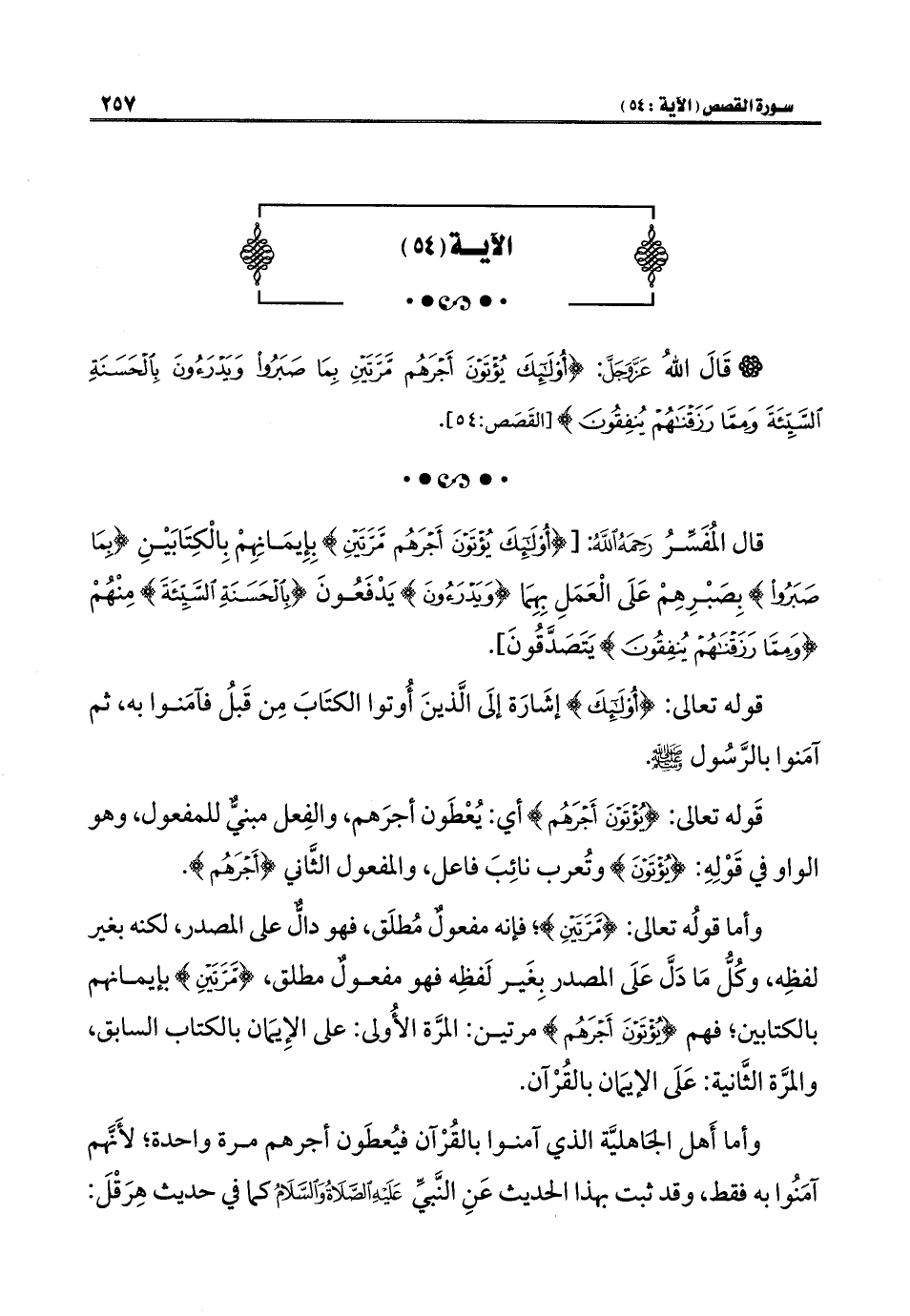 قال المُفَسِّرُ رَحِمَهُ اللَّهُ: [{أُولَئِكَ يُؤْتَوْنَ أَجْرَهُمْ} بِإِيمَانِهِمْ بِالْكِتَابَيْنِ {بِمَا صَبَرُوا} بِصَبْرِهِمْ عَلَى الْعَمَلِ بِهِمَا {وَيَدْرَءُونَ} يَدْفَعُونَ {بِالْحَسَنَةِ السَّيِّئَةَ} مِنْهُمْ {وَمِمَّا رَزَقْنَاهُمْ يُنْفِقُونَ} يَتَصَدَّقُونَ].