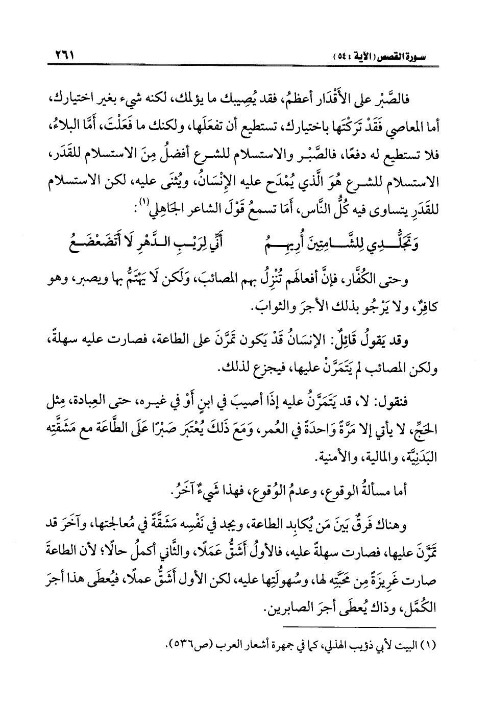فالصَّبْر على الأَقْدَار أعظمُ، فقد يُصِيبك ما يؤلمك، لكنه شيء بغير اختيارك، أما المعاصي فَقَدْ ترَكْتَها باختيارك، تستطيع أن تفعَلَها، ولكنك ما فَعَلْتَ، أَمَّا البلاءُ، فلا تستطيع له دفعًا، فالصَّبْر والاستسلام للشرع أفضلُ مِنَ الاستسلام للقَدَر، الاستسلام للشرع هُوَ الَّذي يُمْدَح عليه الإِنْسَانُ، ويُثنَى عليه، لكن الاستسلام للقَدَرِ يتساوى فيه كُلُّ النَّاس، أَمَا تسمعُ قَوْلَ الشاعر الجَاهِلي (¬١):
