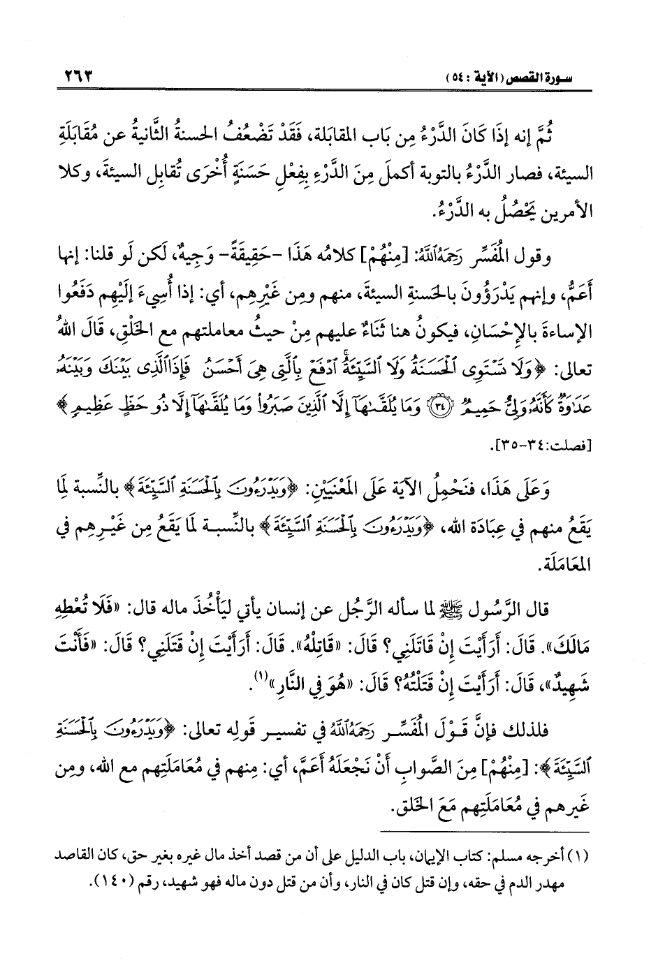 فلذلك فإنَّ قَوْلَ المُفَسِّر رَحِمَهُ اللَّهُ في تفسير قَولِه تعالى: {وَيَدْرَءُونَ بِالْحَسَنَةِ السَّيِّئَةَ}: [مِنْهُمْ] مِنَ الصَّوابِ أَنْ نَجْعَلَهُ أَعَمَّ، أي: مِنهم في مُعَامَلَتِهم مع اللَّه، ومِن غَيرهم في مُعَامَلَتِهم مَعَ الخَلق.