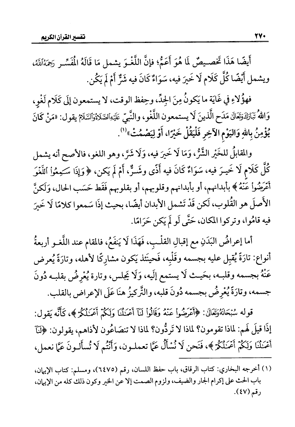 والمقابلُ للخَيْر الشَّرُّ، وَمَا لَا خَيرَ فيه، وَلَا شَرَّ، وهو اللغو، فالأصح أنه يشمل كُلَّ كَلَامٍ لَا خَيرَ فيه، سَوَاءٌ كَانَ فيه أَذًى وشَرٌّ، أَمْ لَم يَكن، {وَإِذَا سَمِعُوا اللَّغْوَ أَعْرَضُوا عَنْهُ} بأبدانهم، أو بأبدانهم وقلوبهم، أو بقلوبهم فَقَط حَسَب الحال، وَلَكنَّ الأَصلَ هو القُلوب، لَكن قَدْ تَشمل الأبدان أيضًا، بحيث إذَا سَمعوا كلامًا لَا خَيرَ فيه قامُوا، وتركوا المكان، حَتَّى لَو لَم يَكن حَرَامًا.