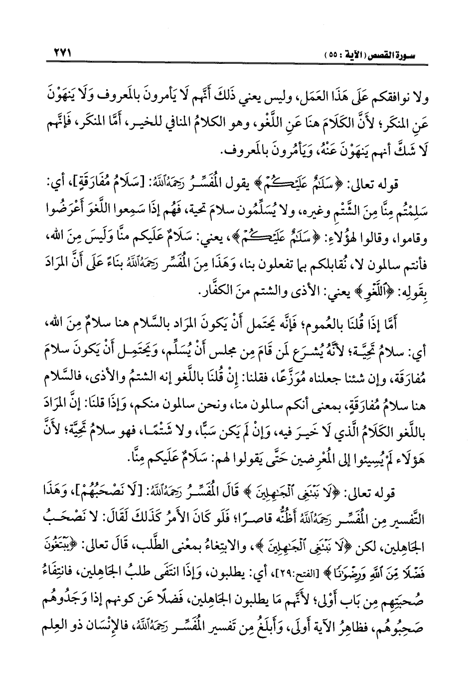 قوله تعالى: {سَلَامٌ عَلَيْكُمْ} يقول المُفَسِّرُ رَحِمَهُ اللَّهُ: [سَلَامُ مُفَارَقَةٍ]، أي: سَلِمْتُم مِنَّا مِنَ الشَّتْمِ وغيره، ولا يُسَلِّمُون سلامَ تحية، فَهُم إذَا سَمِعوا اللَّغوَ أَعْرَضُوا وقاموا، وقالوا لهؤُلاءِ: {سَلَامٌ عَلَيْكُمْ}، يعني: سَلَامٌ عَلَيكم منَّا وَلَيسَ مِنَ اللَّه، فأنتم سالمون لا، نُقابلكم بما تفعلون بنا، وَهَذَا مِنَ المُفَسِّر رَحِمَهُ اللَّهُ بنَاءً عَلَى أَنَّ المرَادَ بِقَولِه: {اللَّغْوَ} يعني: الأذى والشتم منَ الكفَّار.