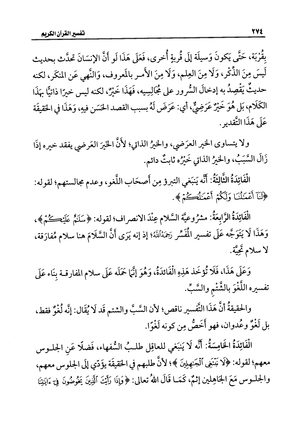 وَعَلَى هَذَا، فَلَا تُؤخَذ هَذِهِ الْفَائدَةُ، وَهُوَ إنَّمَا حَمَلَه عَلَى سلام المفارقة بِنَاء عَلَى تفسيره اللَّغْوَ بالشَّتْمِ والسَّبِّ.