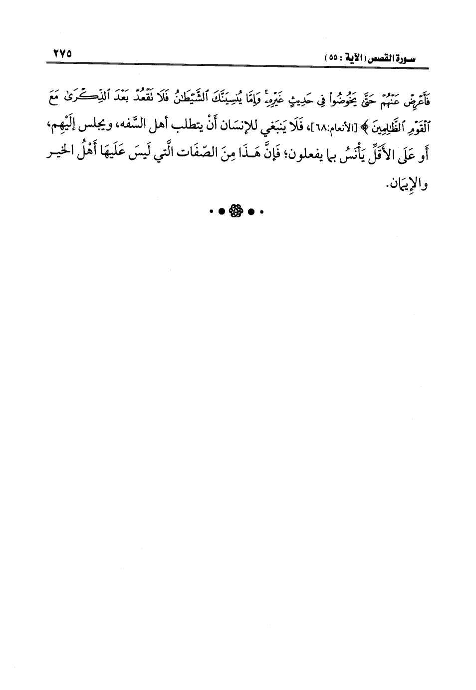 فَأَعْرِضْ عَنْهُمْ حَتَّى يَخُوضُوا فِي حَدِيثٍ غَيْرِهِ وَإِمَّا يُنْسِيَنَّكَ الشَّيْطَانُ فَلَا تَقْعُدْ بَعْدَ الذِّكْرَى مَعَ الْقَوْمِ الظَّالِمِينَ} [الأنعام: ٦٨]، فَلَا يَنبَغي للإنسَان أَنْ يتطلب أهل السَّفه، ويجلس إلَيْهِم، أَو عَلَى الأَقَلِّ يَأْنَسُ بما يفعلون؛ فَإنَّ هَذَا مِنَ الصّفَات الَّتي لَيسَ عَلَيهَا أَهْلُ الخير والإِيمَان.