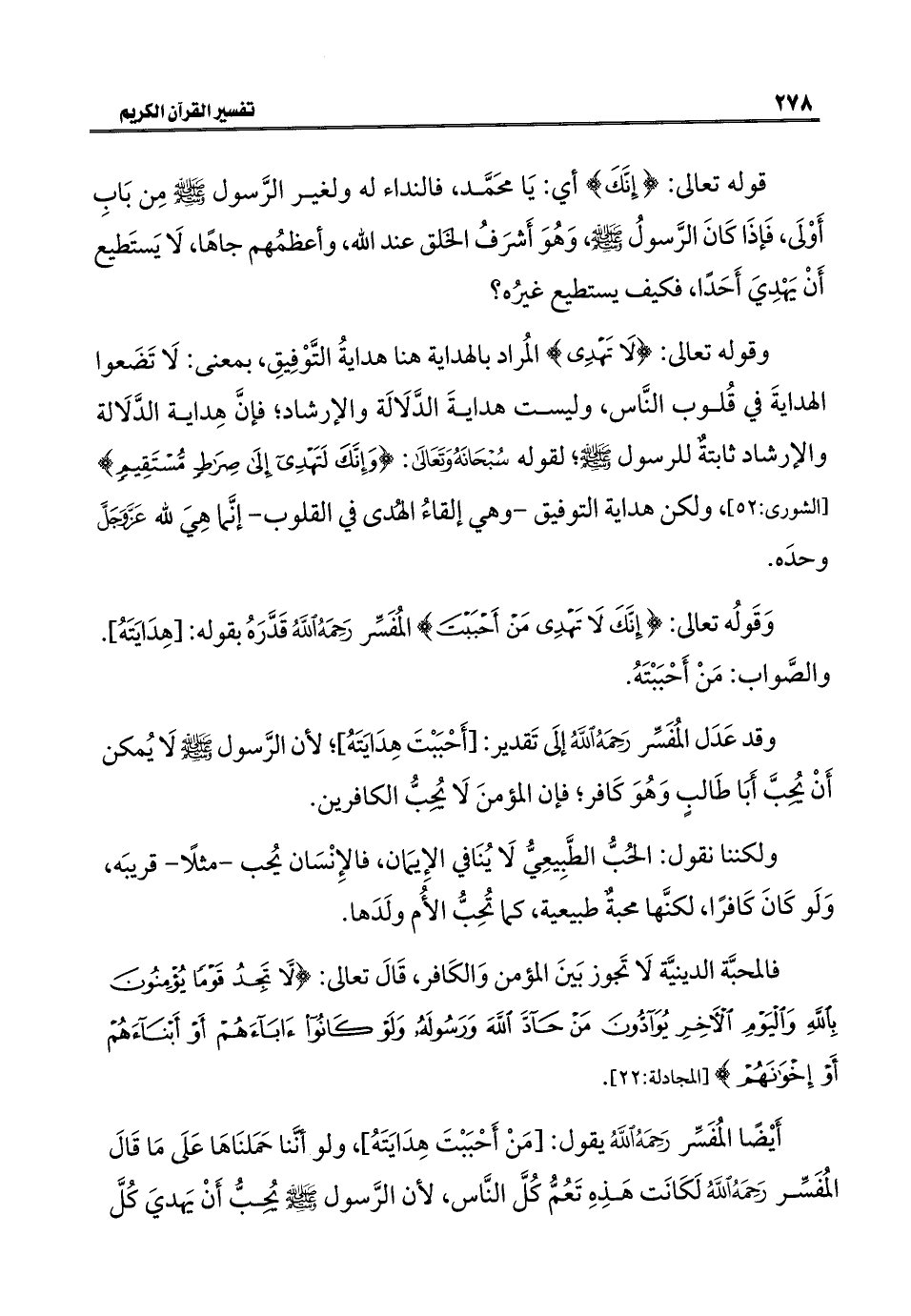 وَقَولُه تعالى: {إِنَّكَ لَا تَهْدِي مَنْ أَحْبَبْتَ} المُفَسِّر رَحِمَهُ اللَّهُ قَدَّرَهُ بقوله: [هِدَايَتَهُ]. والصَّواب: مَنْ أَحْبَبْتَهُ.