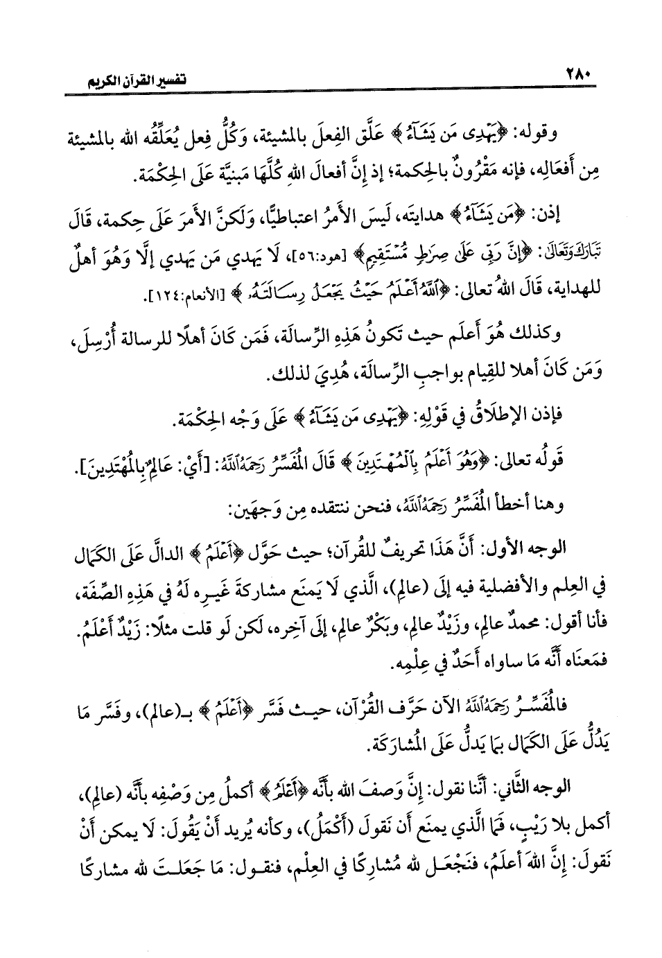 فالمُفَسِّرُ رَحِمَهُ اللَّهُ الآن حَرَّف القُرْآن، حيث فَسَّر {أَعْلَمُ} بـ (عالم)، وفَسَّر مَا يَدُلُّ عَلَى الكَمَال بمَا يَدلُّ عَلَى المُشارَكَة.
