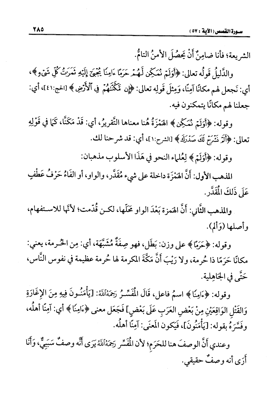 والدَّليلُ قَولُه تعالى: {أَوَلَمْ نُمَكِّنْ لَهُمْ حَرَمًا آمِنًا يُجْبَى إِلَيْهِ ثَمَرَاتُ كُلِّ شَيْءٍ}، أي: نَجعل لهم مكانًا آمِنًا، وَمثلَ قَولِه تعالى: {إِنْ مَكَّنَّاهُمْ فِي الْأَرْضِ} [الحج: ٤١]، أي: جعلنا لهم مكانًا يتمكنون فيه.