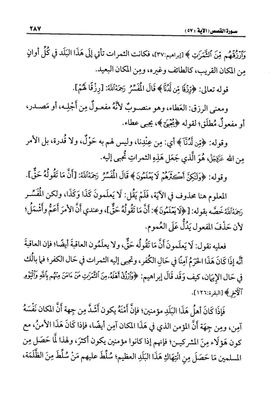 فعليه نقول: لَا يَعلَمونَ أَنَّ مَا تَقُولُه حَقٌّ، ولا يعلَمُون العاقبةَ أيضًا؛ فإن العاقبةَ أنَّه إذَا كَانَ هَذَا الحرَمُ آمِنًا في حَالِ الكُفر، وتجبى إليه الثمرات في حَال الكفر؛ فما بالُك في حَال الإِيمَان، كيف وَقَد قَالَ إبراهيم: {وَارْزُقْ أَهْلَهُ مِنَ الثَّمَرَاتِ مَنْ آمَنَ مِنْهُمْ بِاللَّهِ وَالْيَوْمِ الْآخِرِ} [البقرة: ١٢٦].