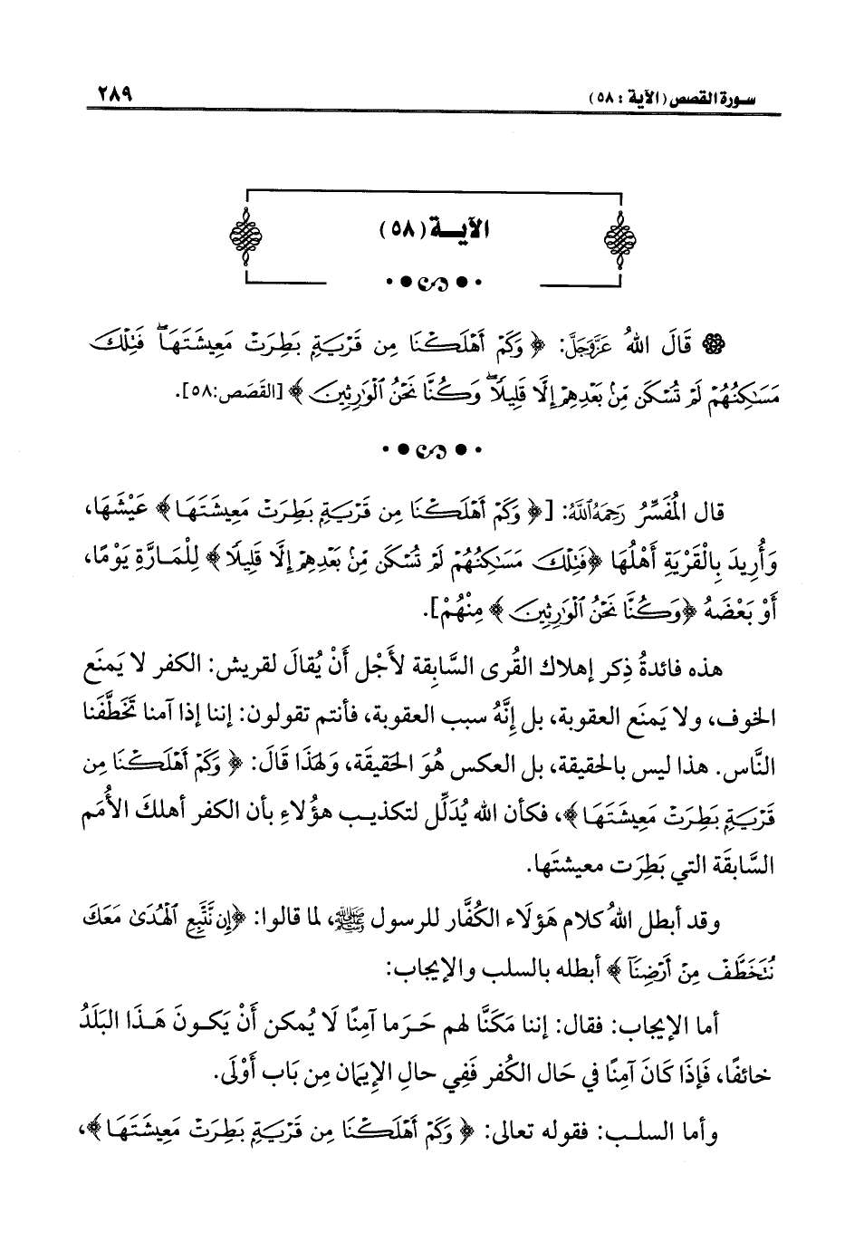 قال المُفَسِّرُ رَحِمَهُ اللَّهُ: [{وَكَمْ أَهْلَكْنَا مِنْ قَرْيَةٍ بَطِرَتْ مَعِيشَتَهَا} عَيْشَهَا، وَأُرِيدَ بِالْقَرْيَةِ أَهْلُهَا {فَتِلْكَ مَسَاكِنُهُمْ لَمْ تُسْكَنْ مِنْ بَعْدِهِمْ إِلَّا قَلِيلًا} لِلْمَارَّةِ يَوْمًا، أَوْ بَعْضَهُ {وَكُنَّا نَحْنُ الْوَارِثِينَ} مِنْهُمْ].