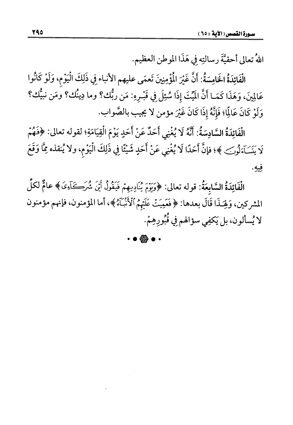 الْفَائِدَةُ الخَامِسَةُ: أَنَّ غَيْرَ المُؤْمِنِينَ تَعمَى عليهم الأنباء فِي ذَلِكَ الْيَوْمِ، وَلَوْ كَانُوا عَالمِينَ، وَهَذَا كَمَا أَنَّ المَيِّتَ إِذَا سُئِلَ فِي قَبْرِهِ: مَن ربُّك؟ وما دِينُك؟ ومَن نبيُّك؟ وَلَوْ كَانَ عَالِمًا؛ فَإِنَّهُ إِذَا كَانَ غَيْرَ مؤمن لا يجيب بالصَّواب.